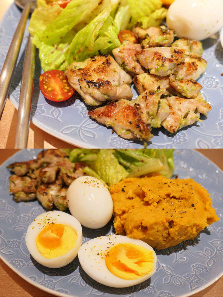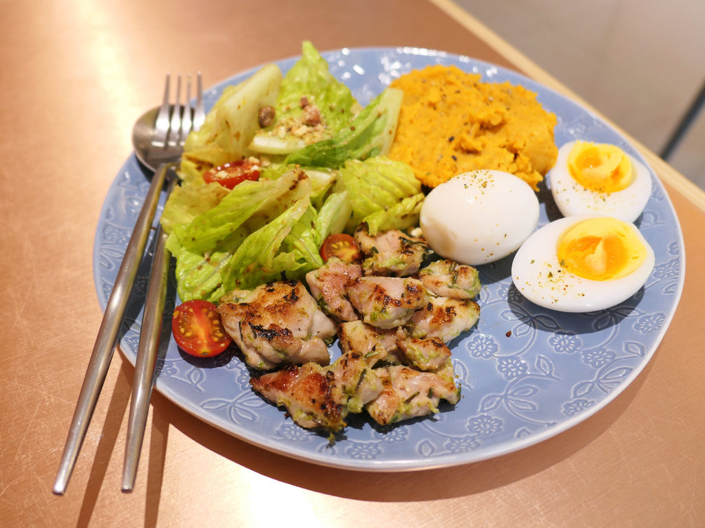 早餐內容物有:青檸迷迭香雞腿肉、巴沙米克醋沙拉、小農放養快樂綠頭鴨蛋、土生土長地瓜泥、研磨無糖有機豆漿(當天換為牛奶)。