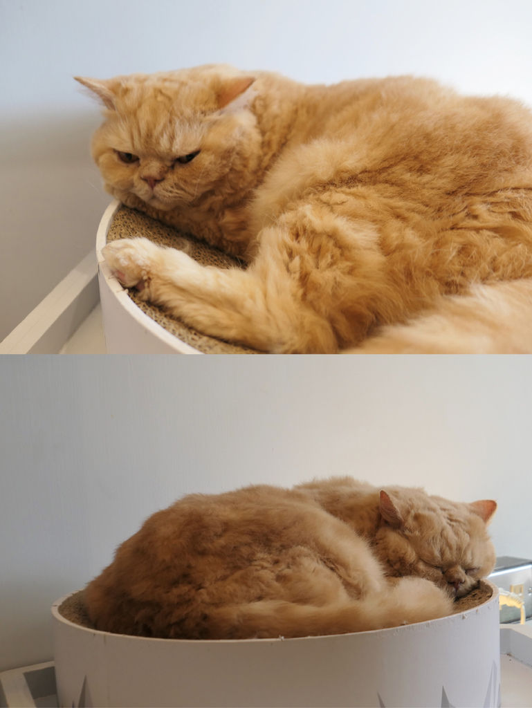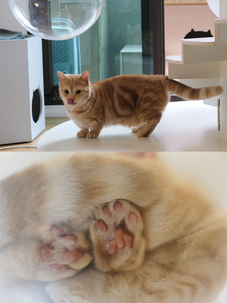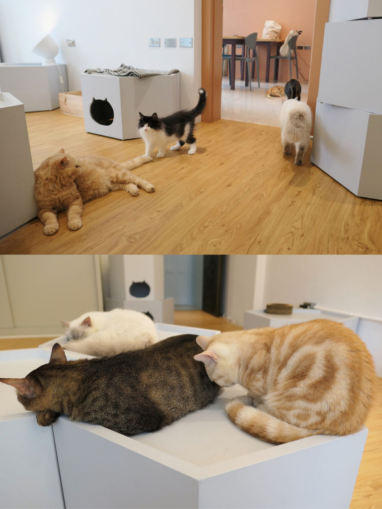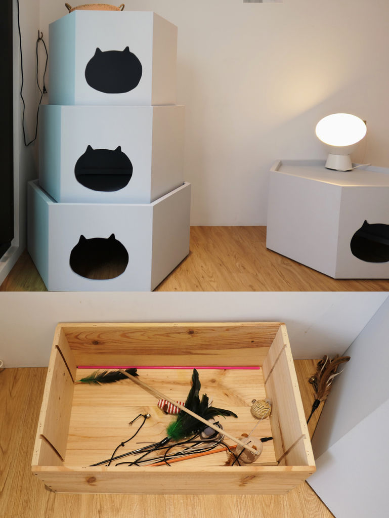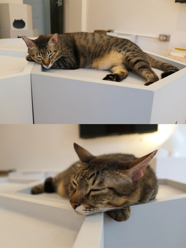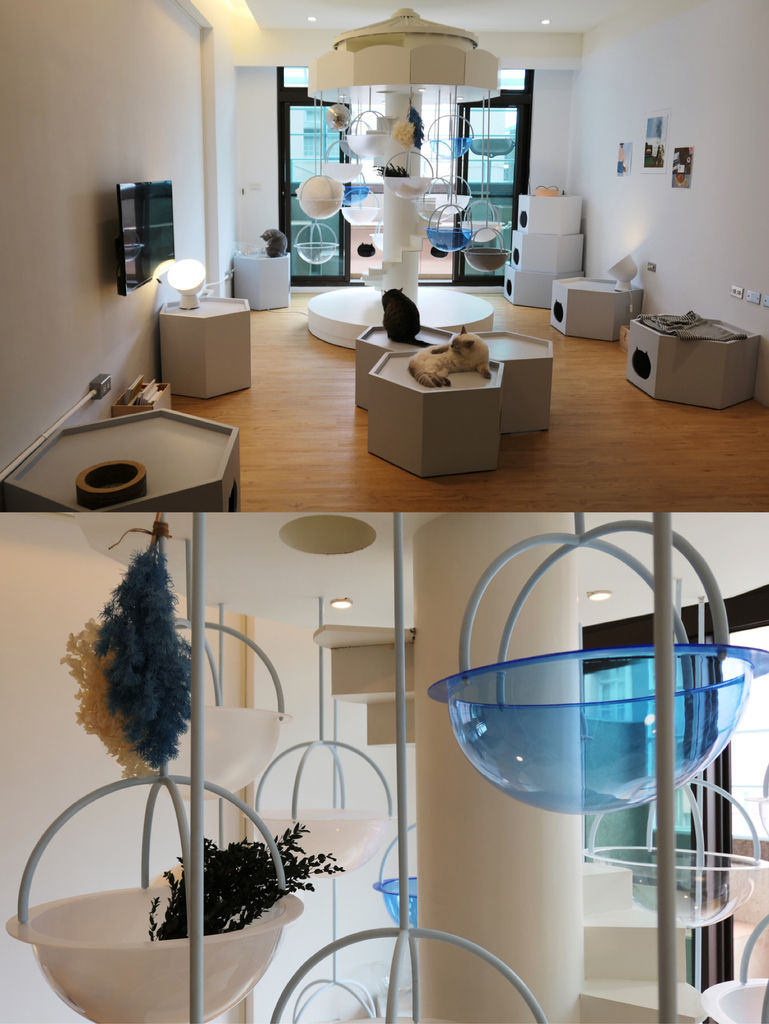 木質的地板上頭放了不少可以讓貓咪窩藏的六角形小箱子,一旁則是有貓咪專屬的步道跟跳台,活像是個旋轉木馬般的遊樂設施。