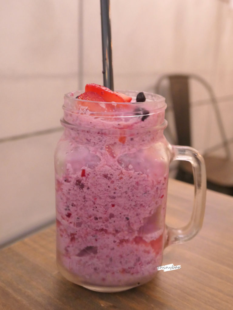 但他們家喝起來感覺比較像水果加上冰塊打碎製成,不過我也不確定就是了,喝起來酸酸甜甜,還有一些新鮮水果的口感,莓果類也對女生很好,不論外觀跟口味,我相信會是一道深受女生喜愛的飲品。
