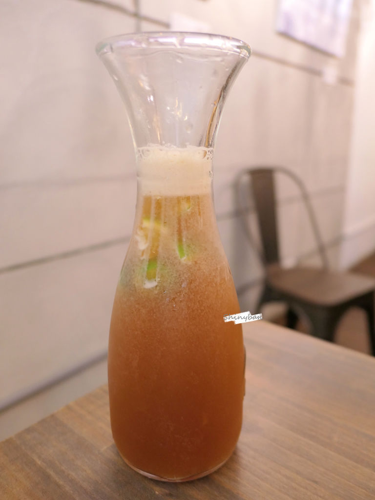 一瓶容量比想像中大,約可以裝兩杯的馬克杯,看顏色就知道茶味很重,水果則扮演很好的配角,增添了清新的香氣跟微酸的滋味。