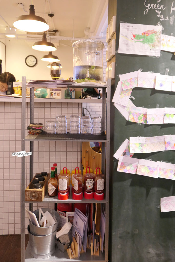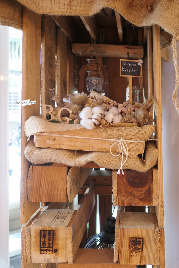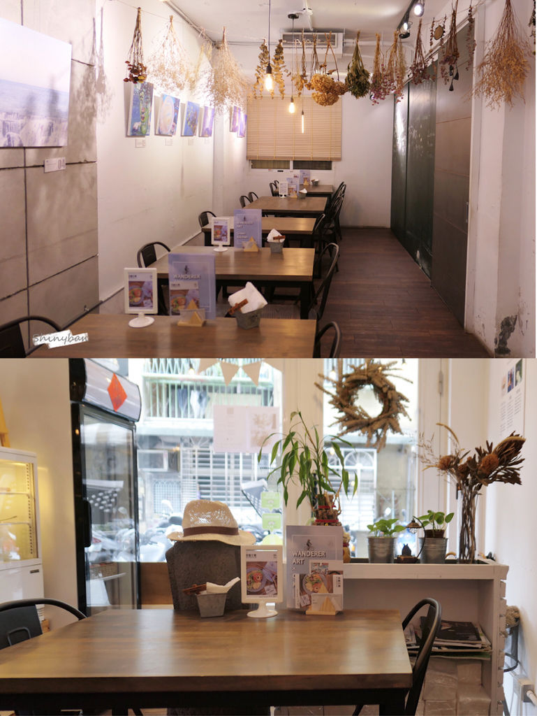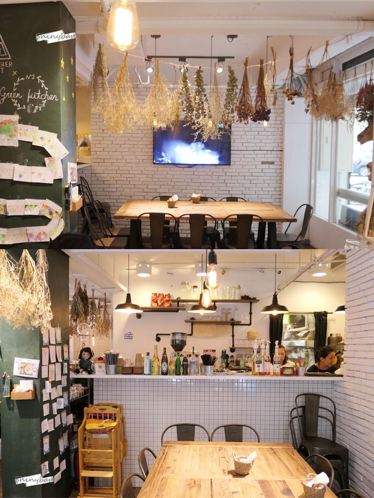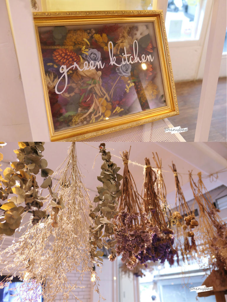 店內的布置多以乾燥花做裝飾,而牆面上則有許多小方塊般的畫作,「Green kitchen 貳」有和行者藝術合作,約三個月會定期舉辦小畫展更新作品,使得整個空間增添不少文藝氣息。