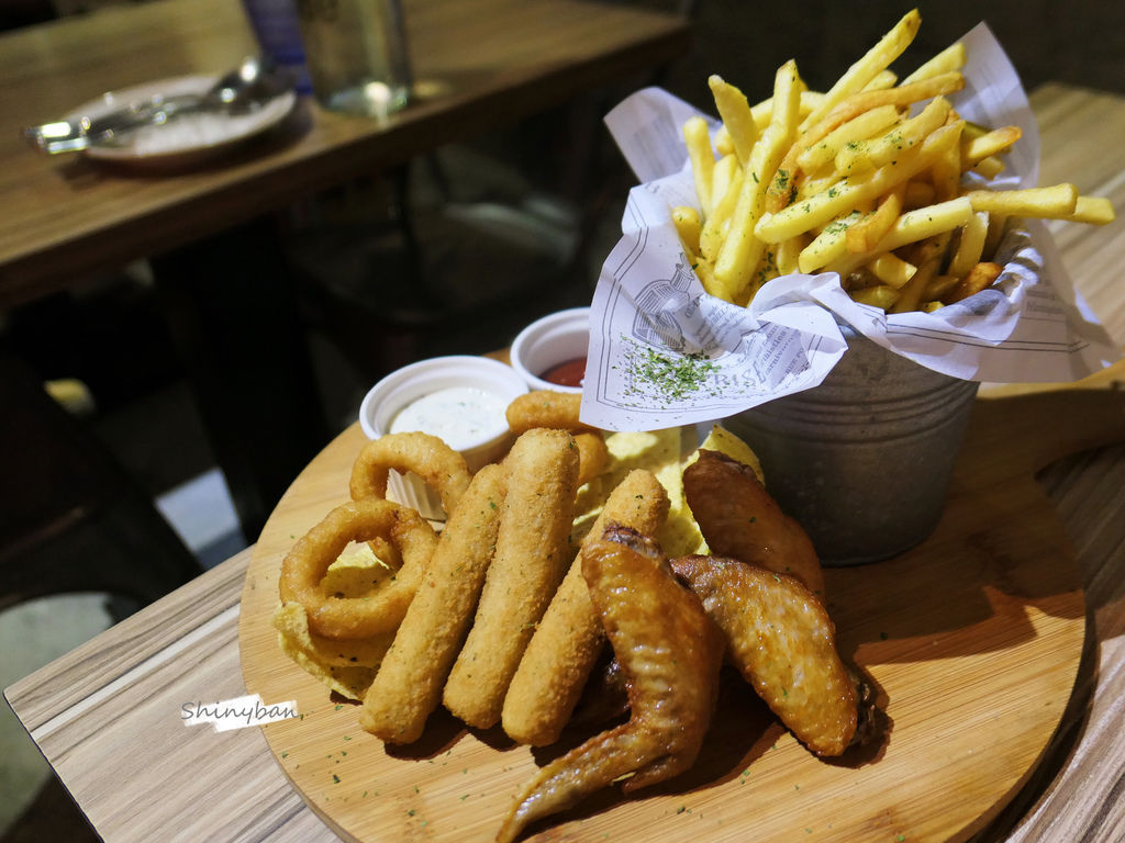炸物拼盤的內容物有:薯條、洋蔥圈、起司條、雞翅還有玉米脆片,以份量跟價格來說,CP值有點低,每樣表現都是一般般,沒有太令人印象深刻之處,不過很下酒倒是。