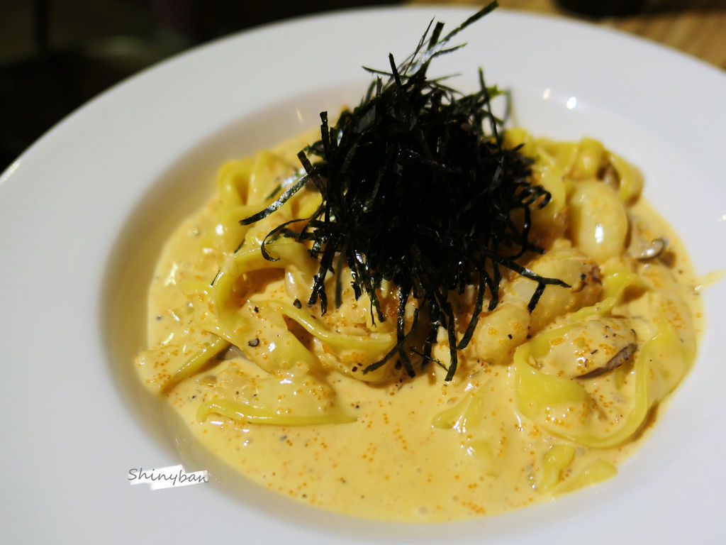 寬麵的口感有點像刀削麵或是麵疙瘩,很Q很有口感,我個人非常喜歡。而裏頭的材料有蟹腳肉跟明太子,搭著上頭的海苔絲,吃起來濃郁,帶有海鮮的鮮味及甜味。