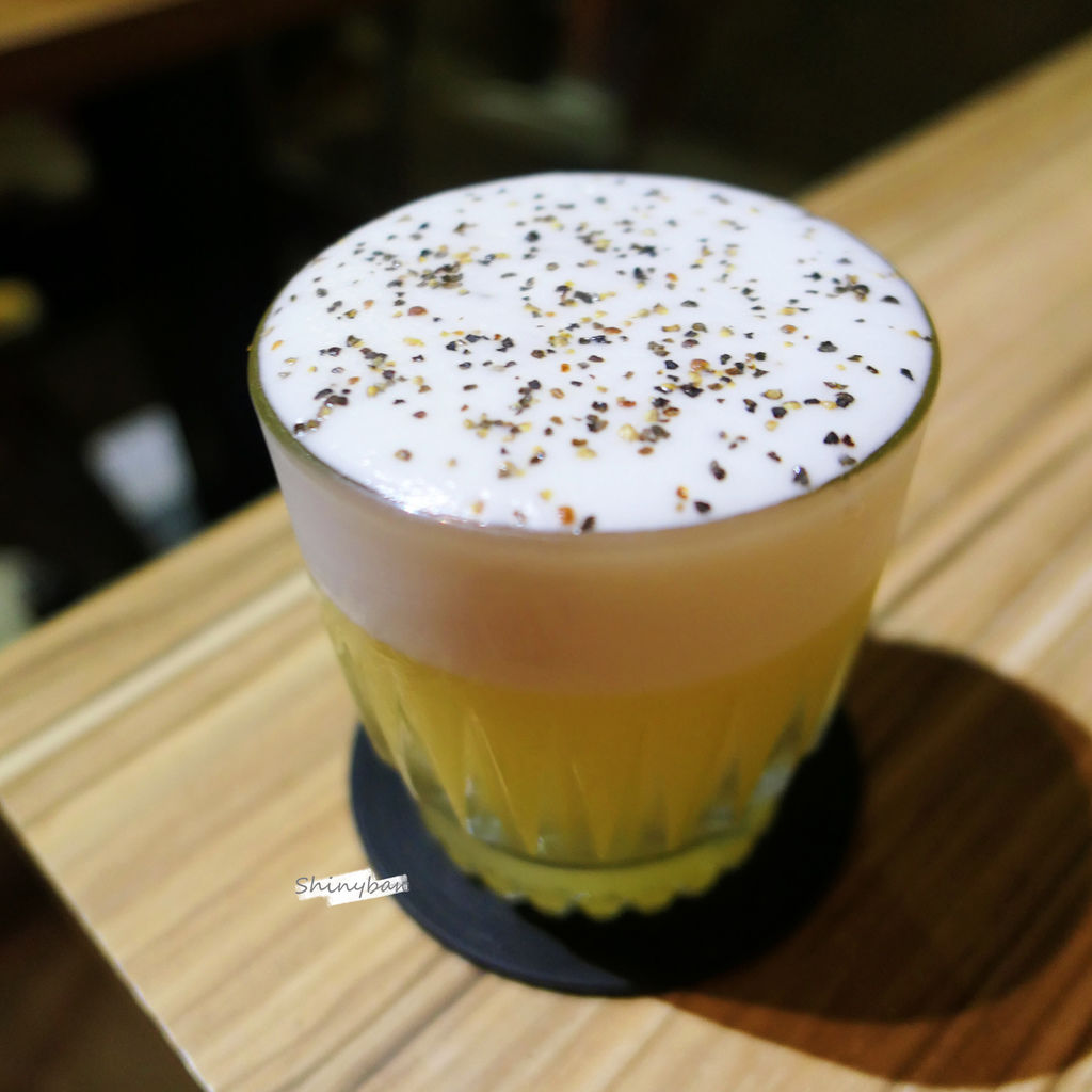 看似衝突,喝起來甜味帶點胡椒粒的微辣,味道滿和諧,上面有一層以蛋白製成的泡沫,喝到最後其實有點腥。