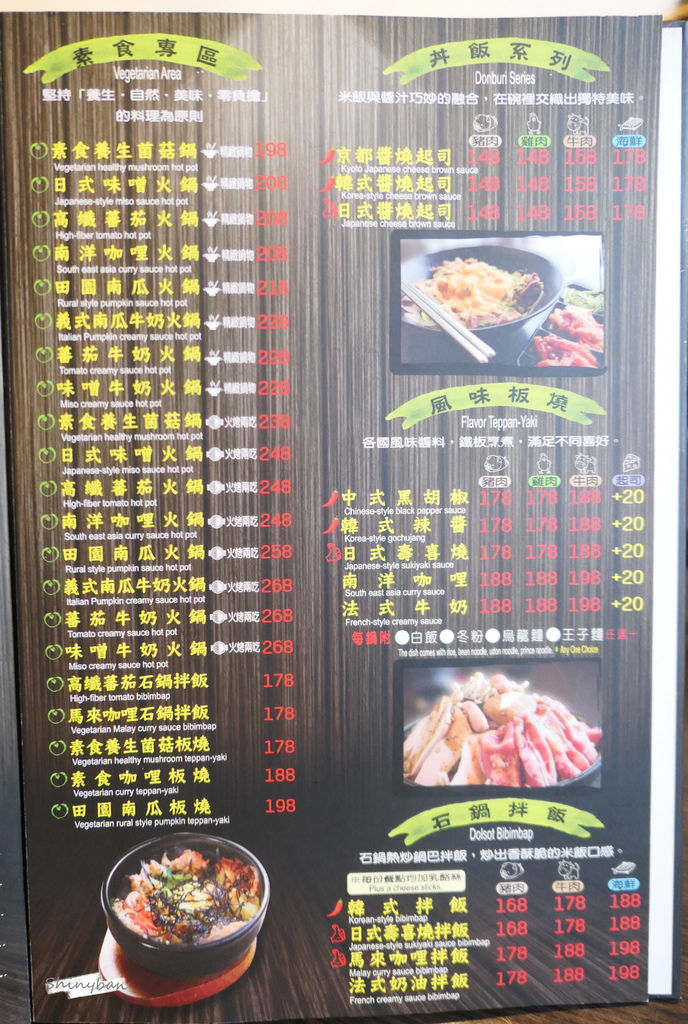 「哈帕叔叔」共有十五種湯頭、七種肉品可以做選擇,這樣配對下來組合真的多到不得了,而且不僅僅有火鍋,還有火烤兩吃、丼飯、石鍋以及板燒可以做選擇,選擇十分多樣,另外店家也有素食專區,竟然有超過二十種以上的素食餐點,真的是很貼心。