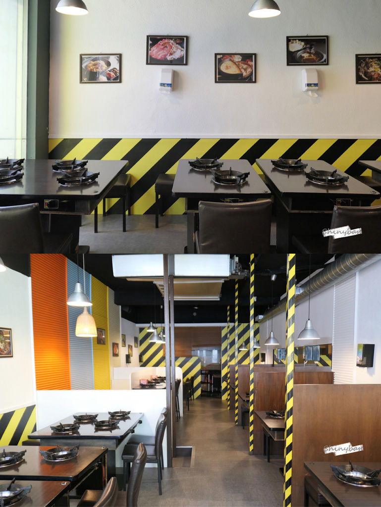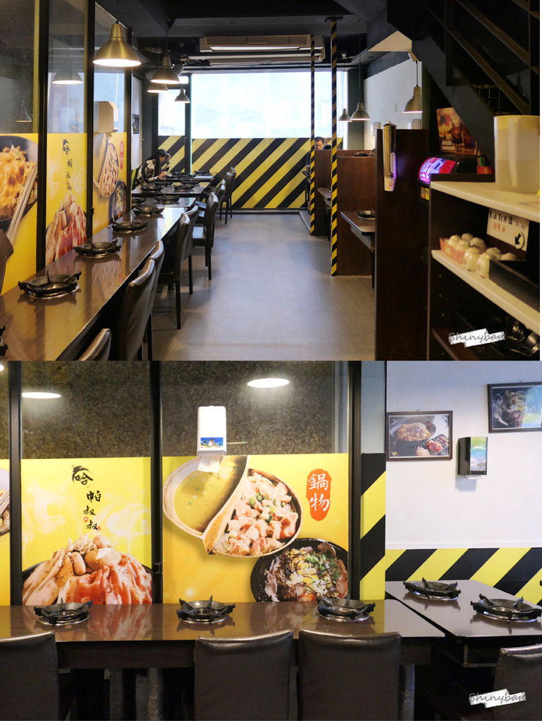 「哈帕叔叔」一樓是一間飲料店,走上樓梯才進到店內,總共有兩層樓,二三樓的裝潢布置都很雷同,以簡單傳統的桌椅搭上黑黃相間的貼紙做布置,三樓採光相對明亮些。