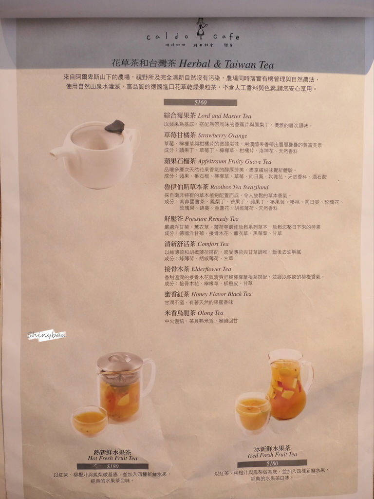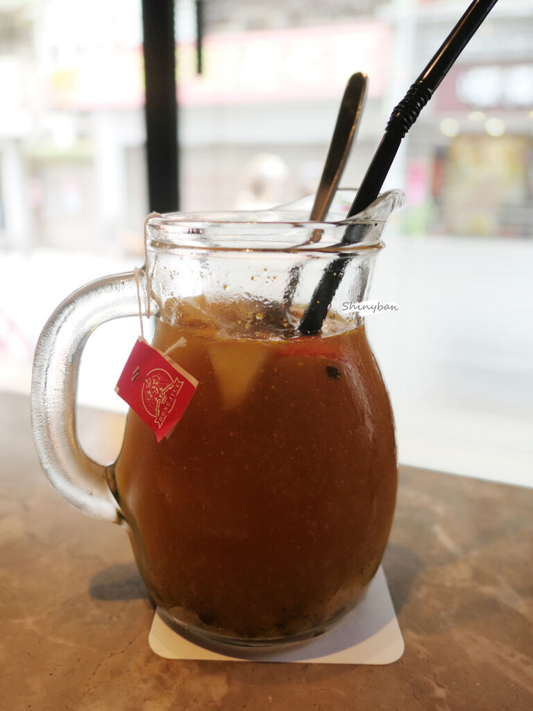 水果茶對我來說甜度偏高,我有再加水喝起來比較剛好,裡面蘋果切片跟百香果,不時增加點口感。但以口味、豐富度、精緻度來說,我還是喜歡「咖啡弄」多一些。