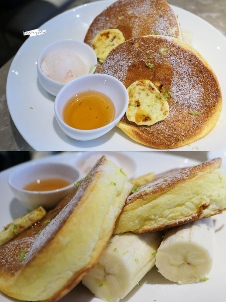 和「Bills」Ricotta hotcake很相似的是上面都有撒上糖粉及擺上奶油,搭配的水果都是新鮮香蕉。「咖朵咖啡」一旁則多附上了雪酪,我吃起來是葡萄柚口味,跟蛋糕本身滿不搭的,附上的蜂蜜也比「Bills」的楓糖漿少了一些香氣,整體外觀相似,但不管口感跟口味都不太相同。