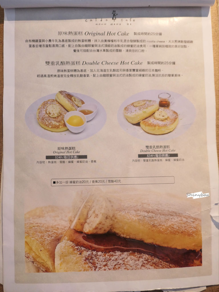 而這間「咖朵咖啡」的特色餐點就是現烤的熱甜點,其中一項熱蛋糕似乎就和「Bills」Ricotta hotcake材料和做法極為相似,讓我在到訪前就十分期待,希望能吃到還原度很高的Ricotta hotcake。