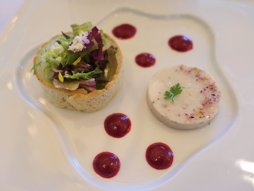 開胃小品吃起來類似蒸蛋,上頭則是菇類的芡汁,蒸蛋口感吃起來非常特別,由於是冰的,很像是鹹的奶酪,紮實而細緻綿密,但或許是平常很少吃這種精緻的法式餐點,所以口味不是太習慣。