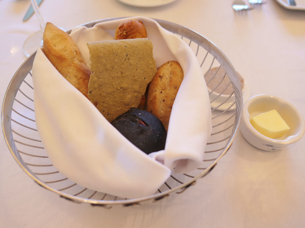 餐廳有提供五種麵包可作享用,嚴格說來是四種麵包加上一個餅乾,麵包有法國迷你長棍、墨魚麵包、起司麵包及藜麥麵包(沒記清楚可能有點小錯誤),一旁有兩種奶油可以做塗抹,一上桌熱熱吃真的很好吃,也可以續加,餅乾則是黑胡椒起司口味,很香很涮嘴。