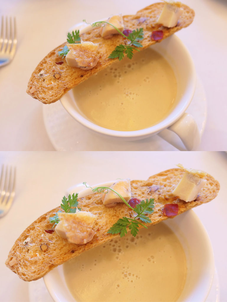 這道湯品的鵝肝醬及松露我覺得都是配角,這玉米雞濃湯濃郁又鮮香,像是將材料完全打成泥狀般的自然濃稠,調味也做得非常到位,很對我的胃。