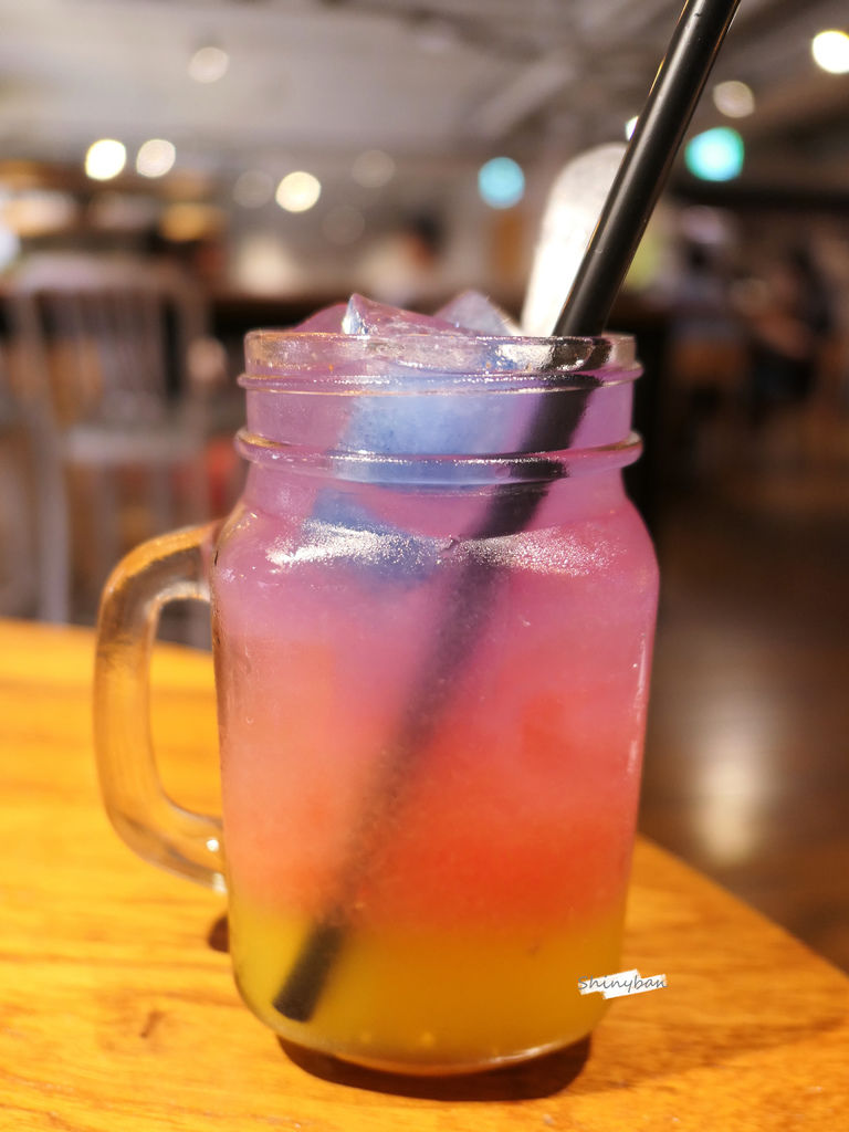 內容物有鳳梨、葡萄柚及蝶豆花,整杯的漸層色澤很美麗,喝起來酸酸甜甜很清爽,很適合夏天。
