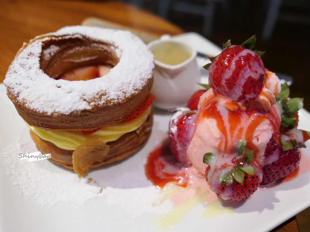 可拿滋就像是個千層派甜甜圈,夾著卡士達奶油和草莓,最後撒上糖粉,一旁還有煉乳跟草莓冰淇淋配著吃,甜度稍高,但是外觀十分少女心。