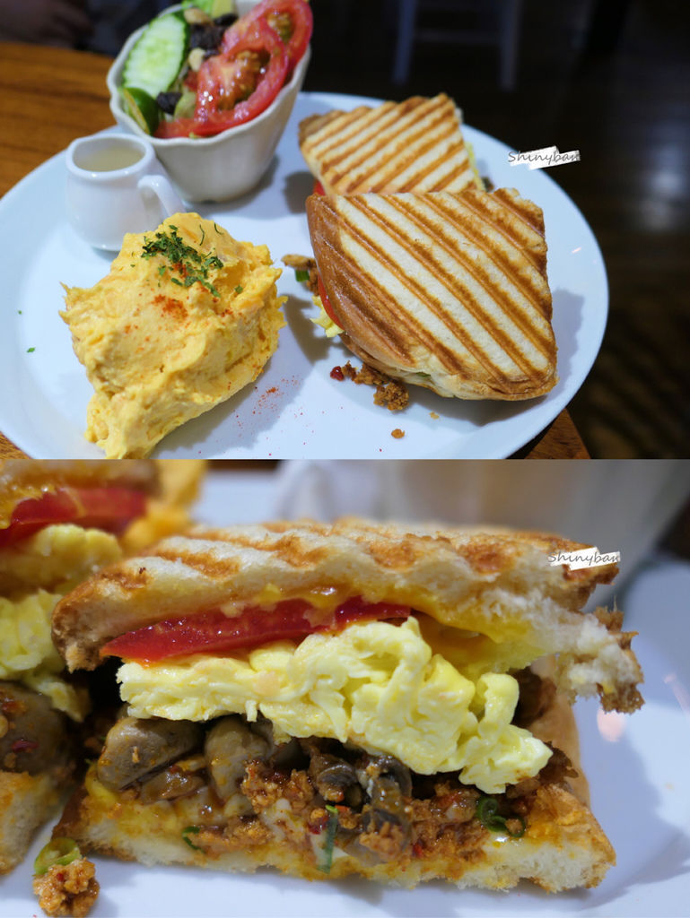 辣豬肉跟打拋豬的味道相似,搭配鬆軟的炒蛋跟微酸的番茄很搭,不過這種吐司一樣都有個致命點,就是很容易因為餡料的水分而變得口感不佳,這道我覺得更好吃的,是旁邊的地瓜馬鈴薯泥,綿密又有自然甜味。