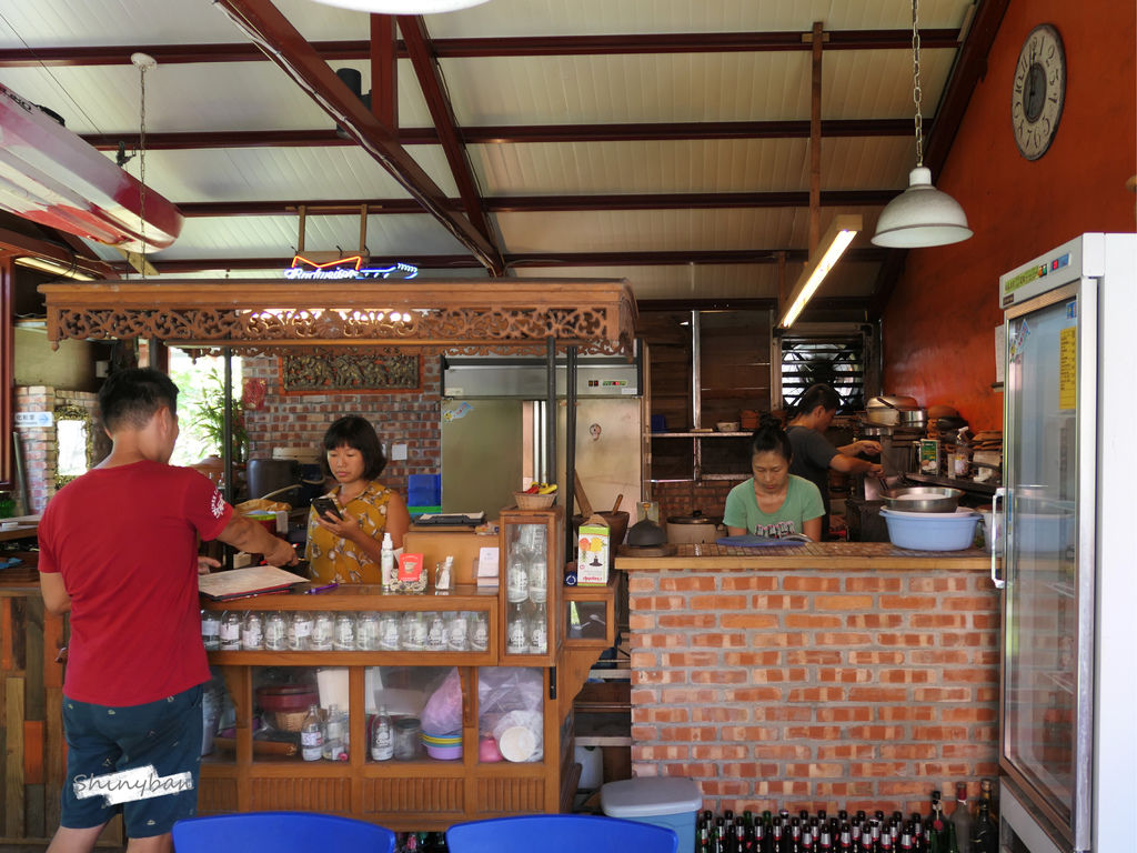櫃台是移動攤位的餐車,第一次看到是用木製的很特別,雕花也十分精緻,聽說這些擺設都是老闆老闆娘從泰國原汁原味搬來的,果然真的營造出泰式小攤販氛圍,一旁是用紅磚瓦砌成的吧檯,整體有種懷舊的古早味。