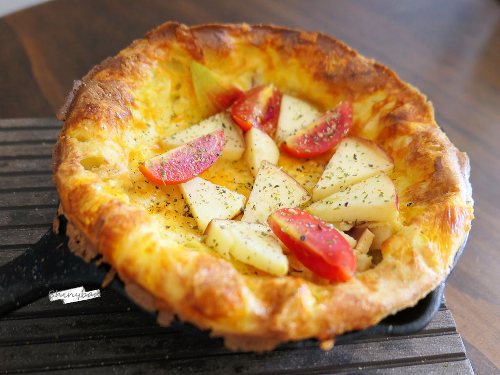 這是一道鐵鍋鬆餅的餐點,之前在花蓮就有吃到類似的,吃起來是有點雞蛋糕的口感,相較一般的鬆餅蓬鬆,鍋邊還能稍微吃到焦香的口感,除了起司之外,上頭還有擺放一些蘋果跟小番茄增添口感及味道,整體吃起來比想像中清爽。