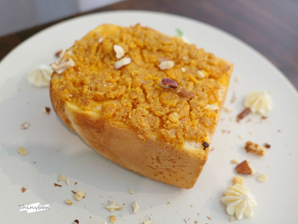 這道算是他們家的特色餐點,也是店員的推薦,鹹流沙指的是鹹蛋黃,一般只會在粽子或是蛋黃酥裡看到的食材,口味吃起來鹹香鹹香,由於水分很少,所以不會因為放置太久而讓吐司變得過濕口感不佳。