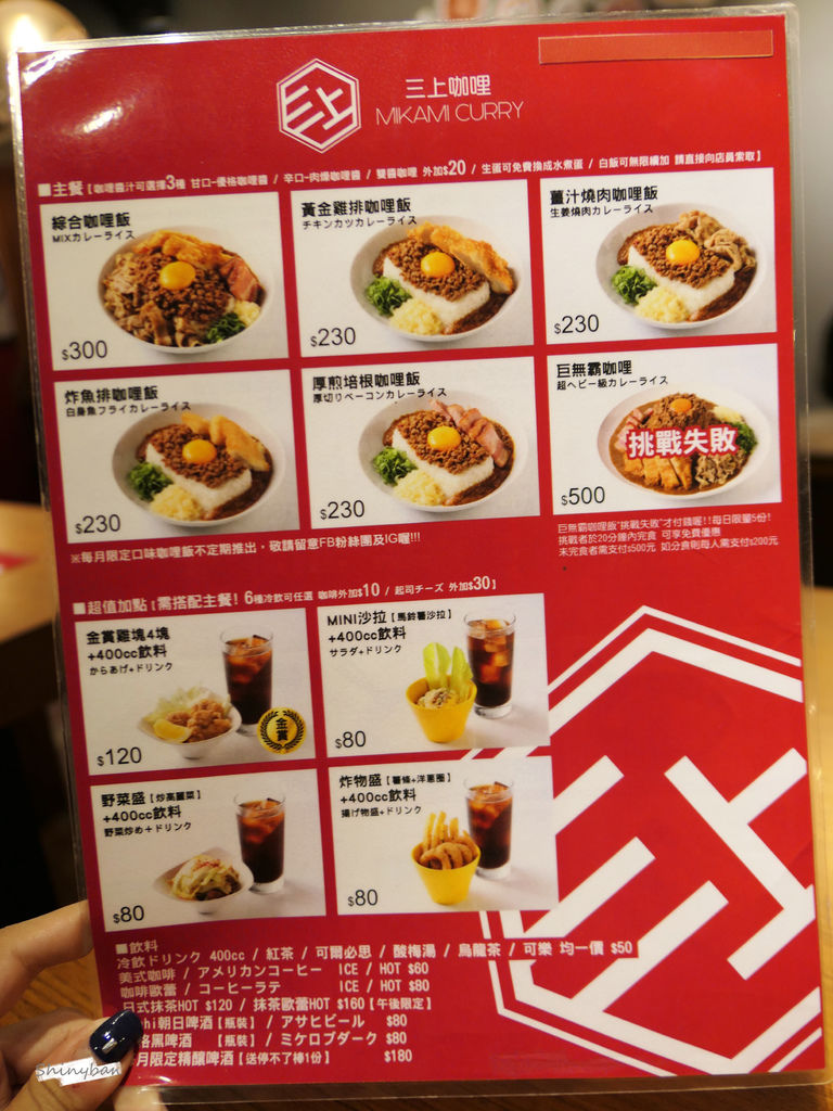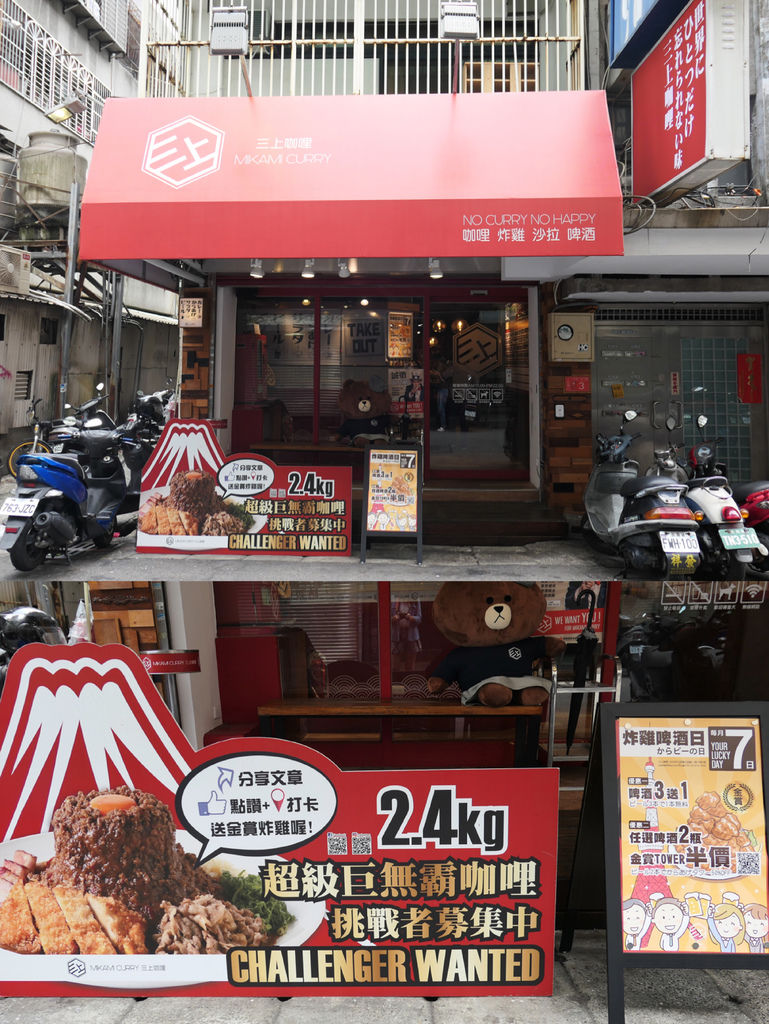「三上咖哩」外觀是很一致的紅白配色,巨無霸咖哩的醒目看板很吸睛,超級巨無霸咖哩算是店家的特色之一,下面會比較詳細的做介紹,對自己食量有信心的人不妨可以來嘗試看看。