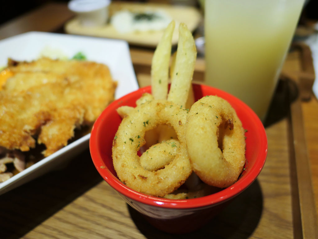 咖哩飯加$80就可以享用到炸物盛(炸洋蔥圈、炸薯條)還有一杯飲料,這分量對男生來說是非常有飽足感的,更別說是女生了,大概是會飽到一段時間不想進食。