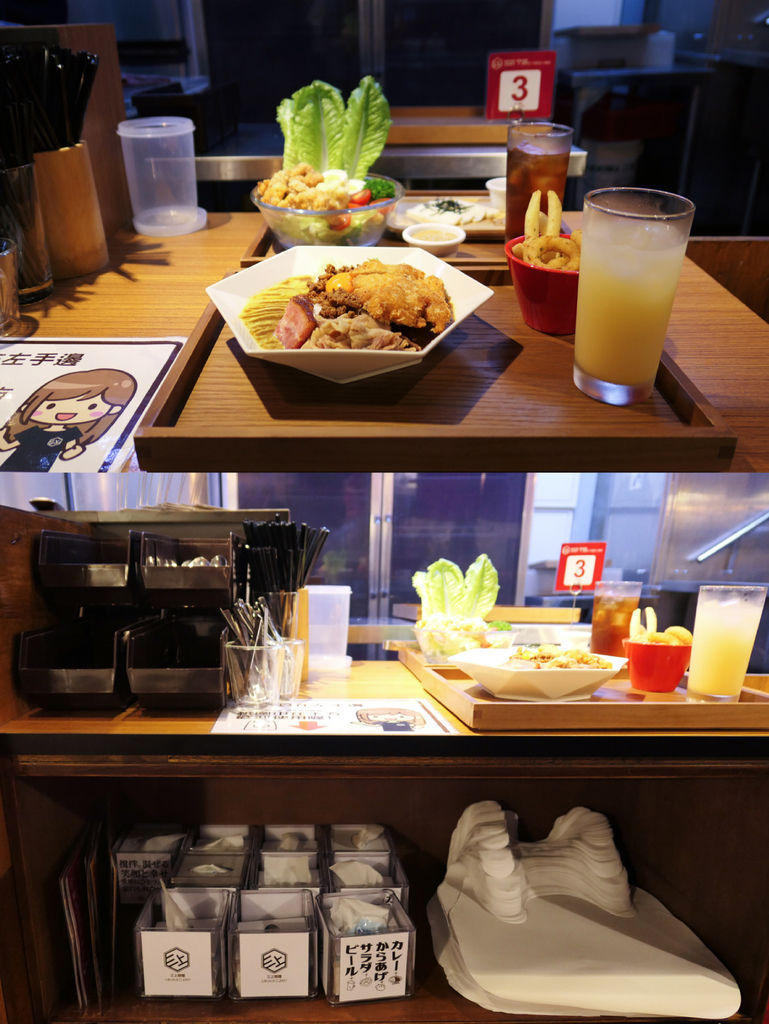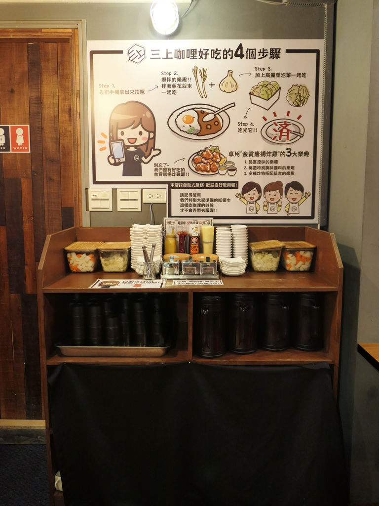 個人覺得很貼心的一點是取餐區就備有餐具、衛生紙、圍兜兜等會用到的用品,可以拿取完後直接將托盤拿到座位上,不用再跑一趟,圍兜兜也可以避免咖哩或炸雞噴濺到心愛的衣服上,不然咖哩真的超難清潔的!