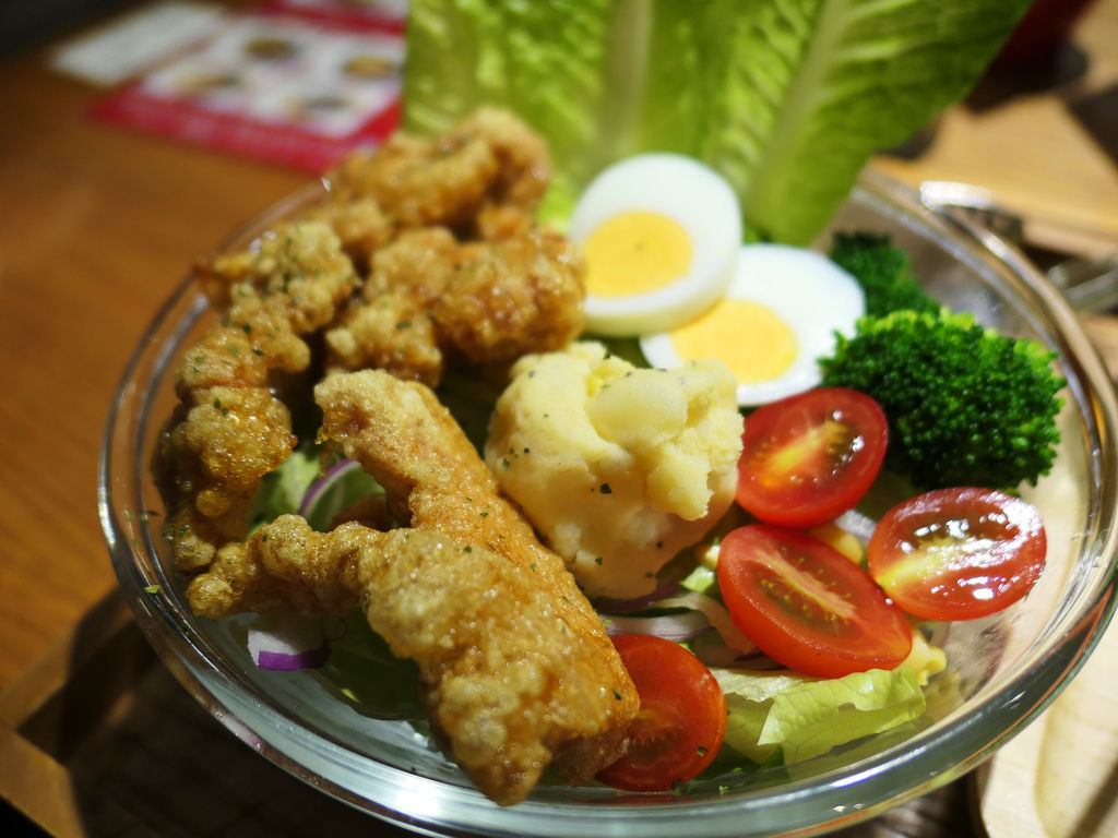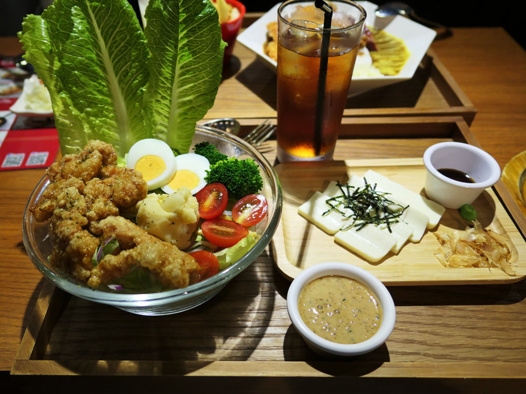 健康取向的人,也可以選擇他們家的炸物沙拉,炸物有四種肉品可以選擇,醬料也是,這時當然不能錯過「三上咖哩」的招牌金賞炸雞啦!醬汁則是選擇酸甜又香氣十足的芝麻醬。