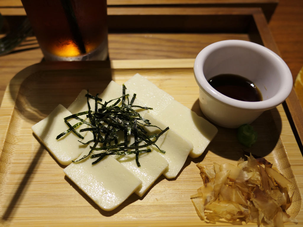 吃法是將一旁的柴魚跟芥末加到醬油內,再夾取豆腐沾取食用,味道跟口感都是以往沒有嘗試過的,有種東西洋合併的感覺,不論是當前菜或是下酒菜都很適合。