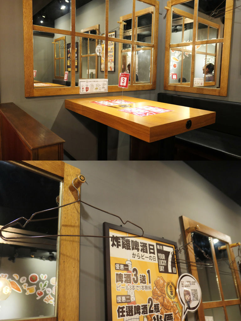 店內是溫馨的黃光配上木桌,紅白配色在很多地方都能發現他們的存在。座位有分為吧檯、雙人桌、四人桌等等,不論是支身前往或是三五好友相聚小酌吃炸雞,都能有很舒適的座位空間。