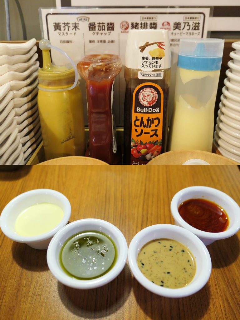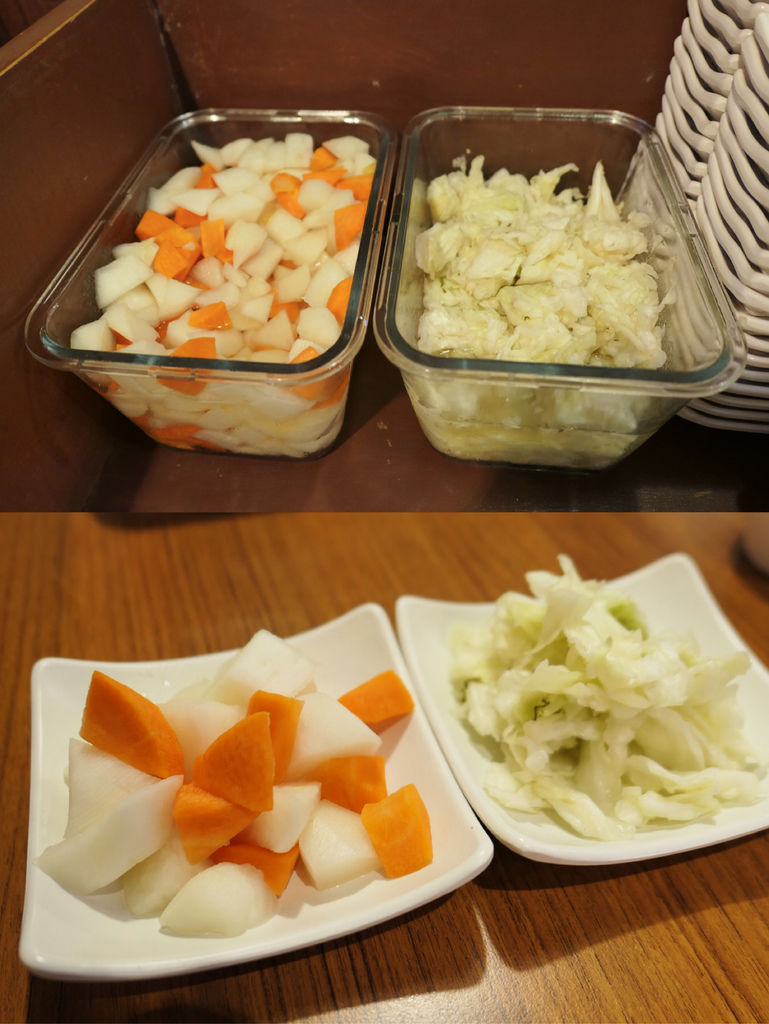 店家也很貼心的備有醬料及泡菜自助吧,黃芥末、豬排醬、番茄醬、美乃滋應有盡有,而泡菜部分有蘿蔔跟高麗菜,酸酸甜甜的,直接吃就非常好吃,清爽又開胃。