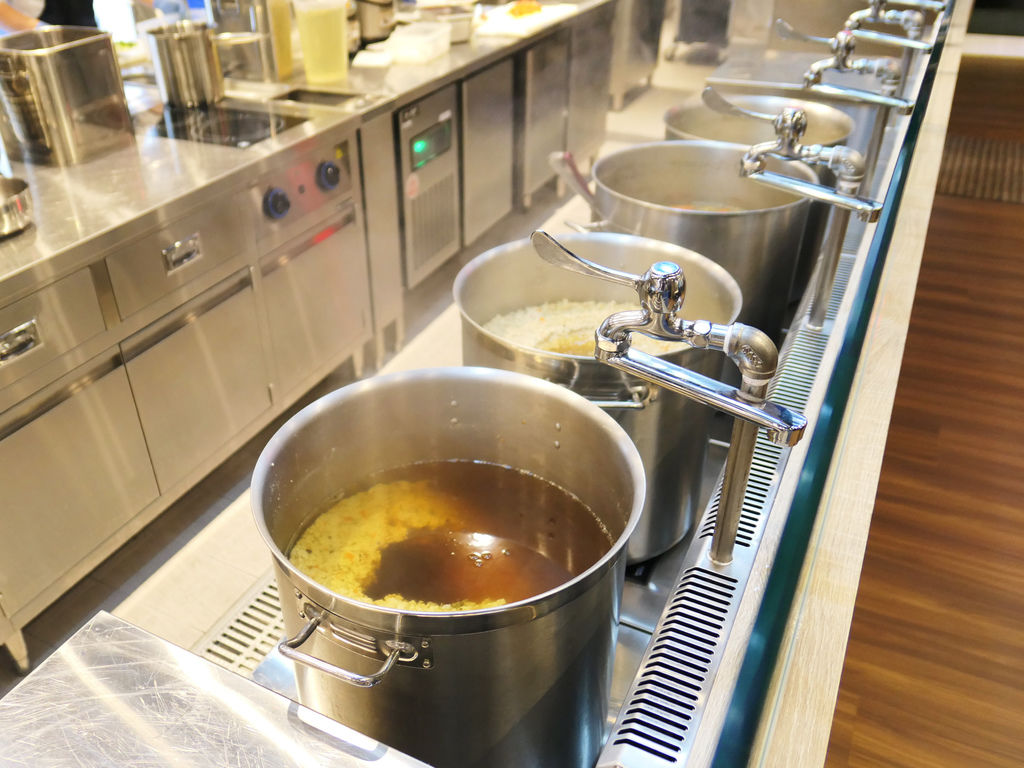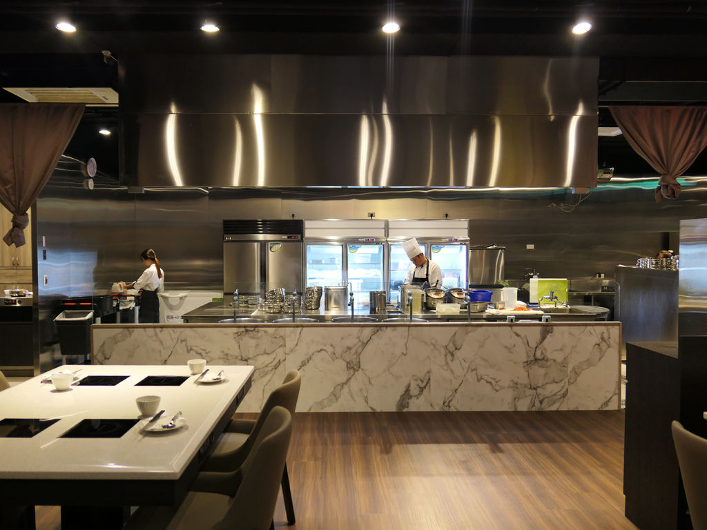 再走進店內深處則是四人桌型坐位,不論是朋友、家人、商務聚餐都十分適合,這裡的視野可以看到更完整的開放式廚房,「德朗火鍋」的靈魂之一湯底,也能一覽無遺。