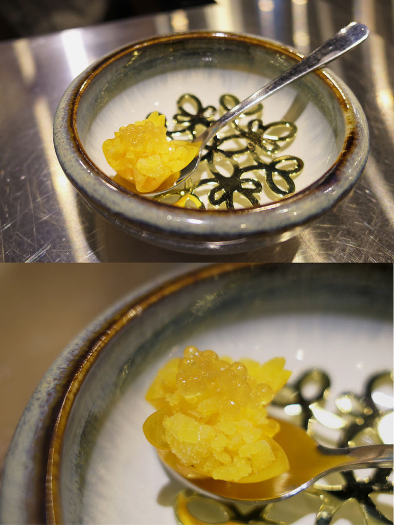 甜點是花蜜檬果,聽起來很饒舌,但這細緻度大概媲美法式料理了吧,有芒果製成的脆片跟芒果冰沙,上頭放上蜂蜜魚子醬點綴,口感豐富,是很適合收尾的甜點小品。