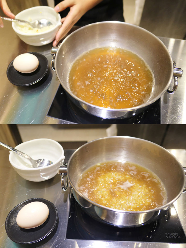 最後店員會使用半碗飯和湯底煮成雜炊,集精華於一碗,但其實也不是像一般煮粥那麼簡單,店員會很細心的將鍋內的所有雜質撈除,再將香米飯倒入,用湯匙稍微輾壓米粒,讓味道能完整滲透,吃起來口感也較綿密。