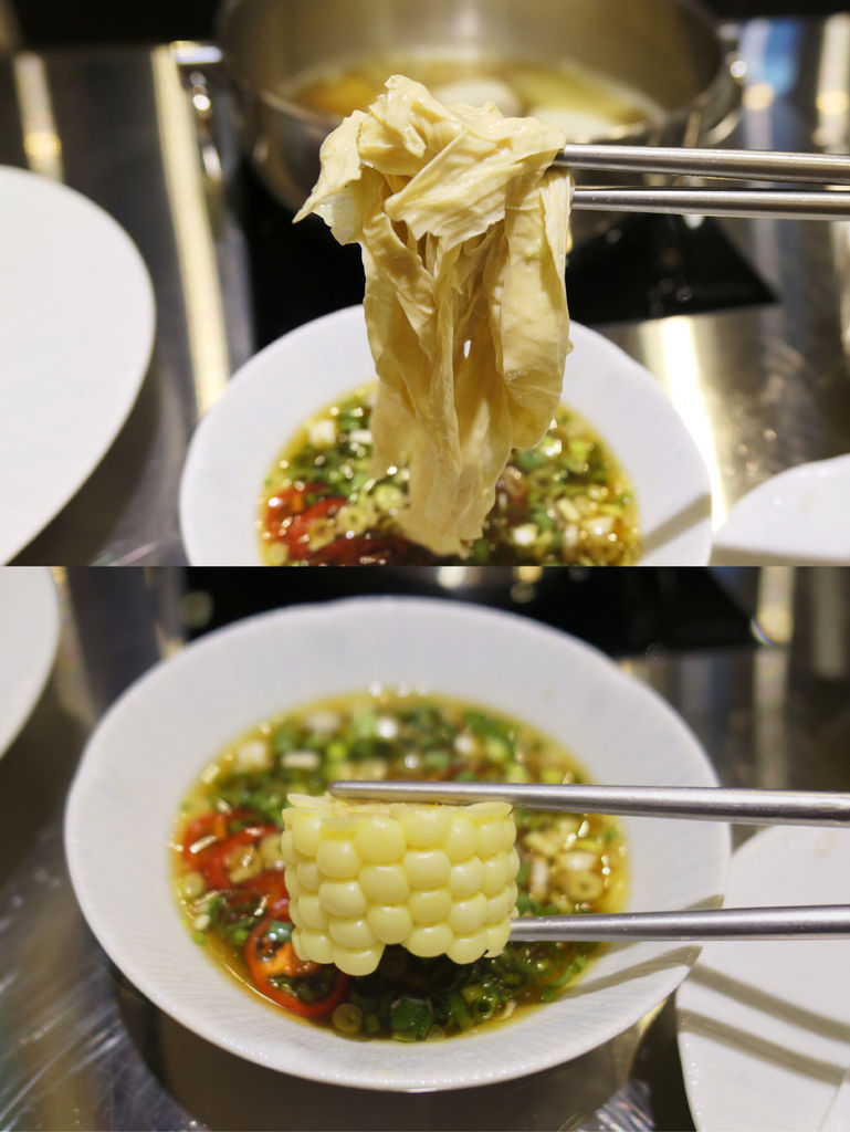 其實我平常吃火鍋是不太沾醬料的,都直接吃食材的原味,頂多就沾點黑醋跟辣椒,但這裡的醬汁是店家使用大量蔬果熬煮,加上西螺白醬油調製而成,最後加上蔥花、辣椒等辛香料,吃起來毫不死鹹,反而帶點甜味很清爽,絲毫不影響食材本身美味,而且沒什麼負擔。