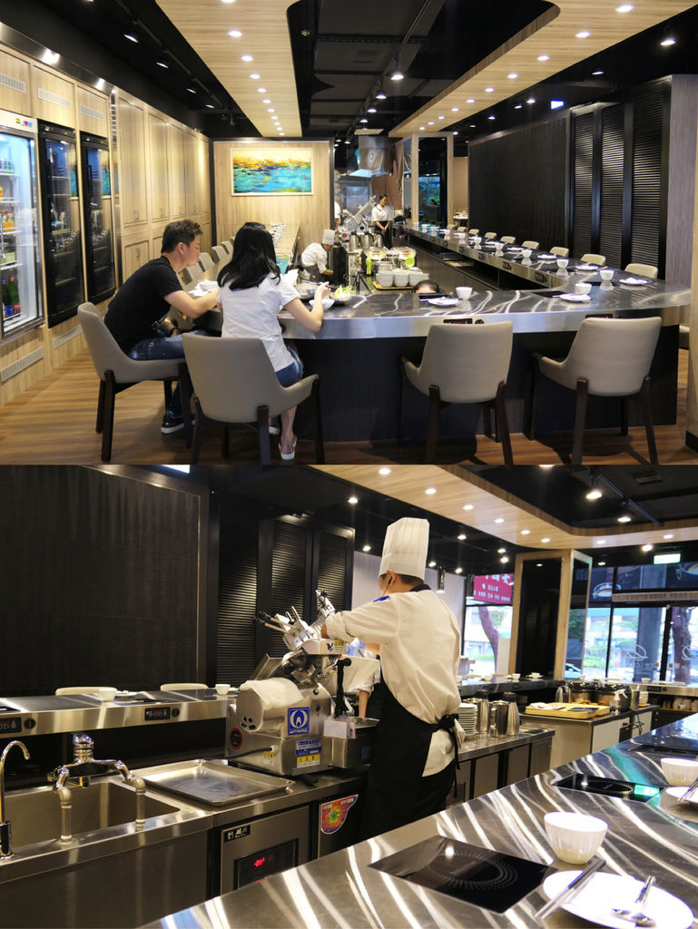 座位則是圍繞著料理區呈現U字形吧檯,乾淨到整個桌子都啵亮,坐在這還可以看到肉品的斷面秀,光是用看的就讓人垂涎三尺。