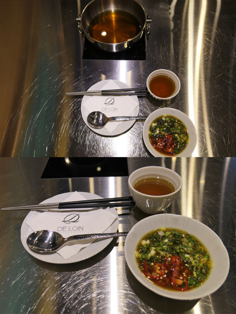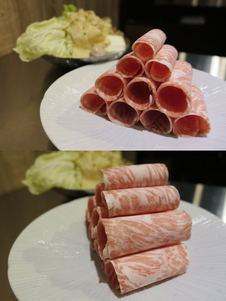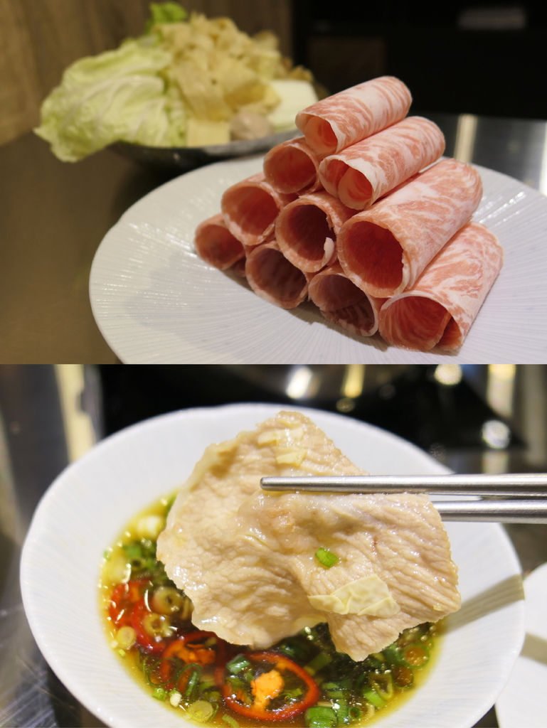 在雞湯中稍微涮個二十秒左右,等到豬肉的粉色都褪去就可以沾上特製醬汁享用,比起牛肉,豬肉的口感更為豐富一些,尤其是松阪豬的脆口,更是令我難以抵抗,油脂絲毫不油膩,比想像中更為清爽,單吃其實就非常美味。