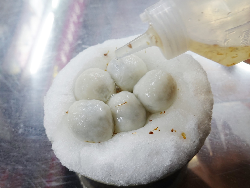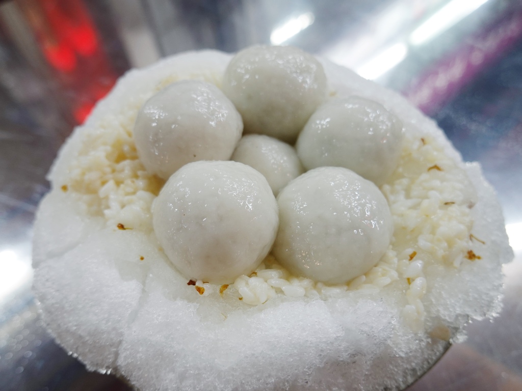 外表其實就是長得跟想像中一樣,餡料湯圓底下鋪著剉冰,上頭再淋上桂花蜜,吃起來也是能想像出來的味道,就是元宵節會自己去超市買的包餡湯圓。