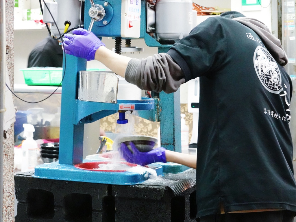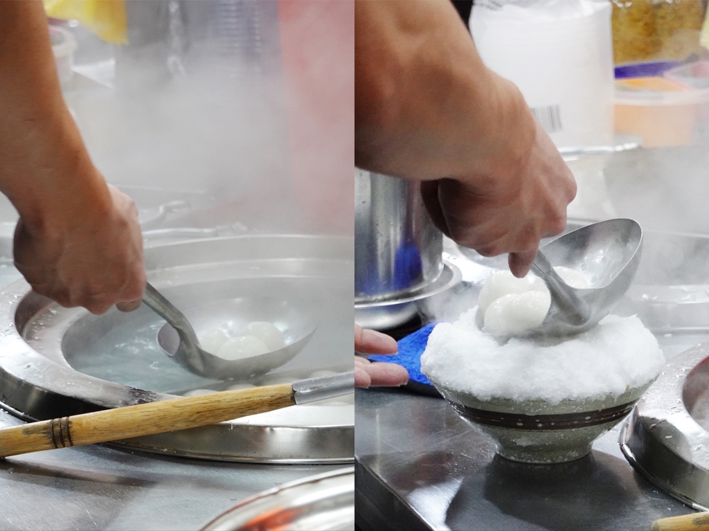 除了酒釀加蛋的湯圓只有做熱的之外,其他品項都可以選擇冰或熱食。在點餐後,店員會先刨整碗的剉冰,上頭再放上剛煮好的湯圓,光是用看的就覺得療癒。