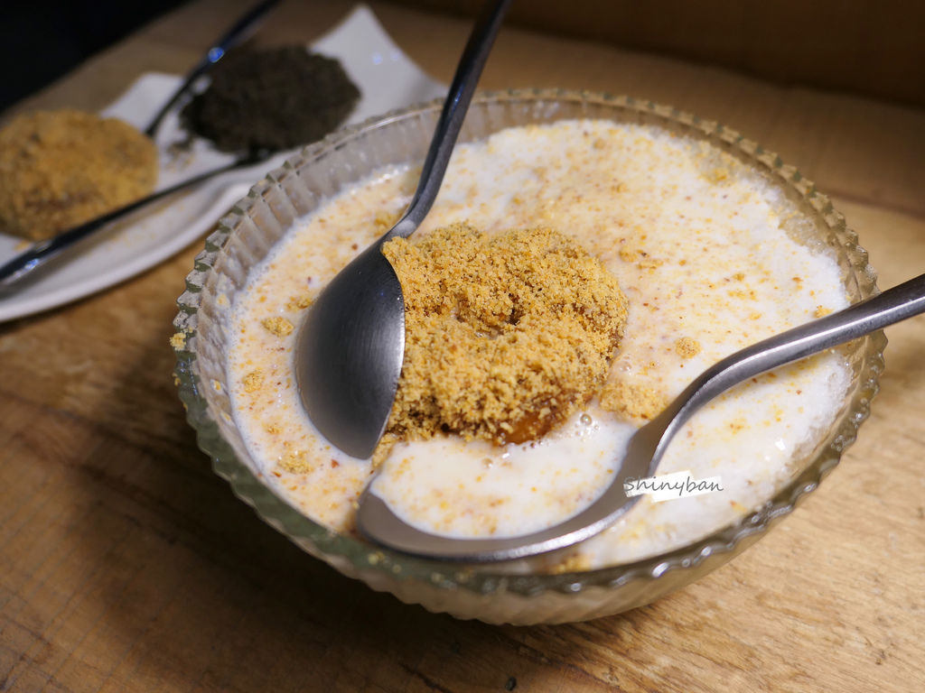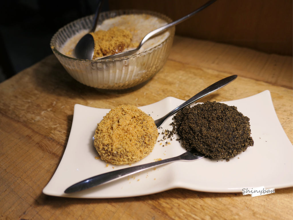 燒麻糬比一般的塊頭小,口感除了麻糬本身的Q軟外,裹粉顆粒也很平均,稍嫌單薄沒有層次,個人覺得食物本身記憶點不大,但環境卻十分令人印象深刻。