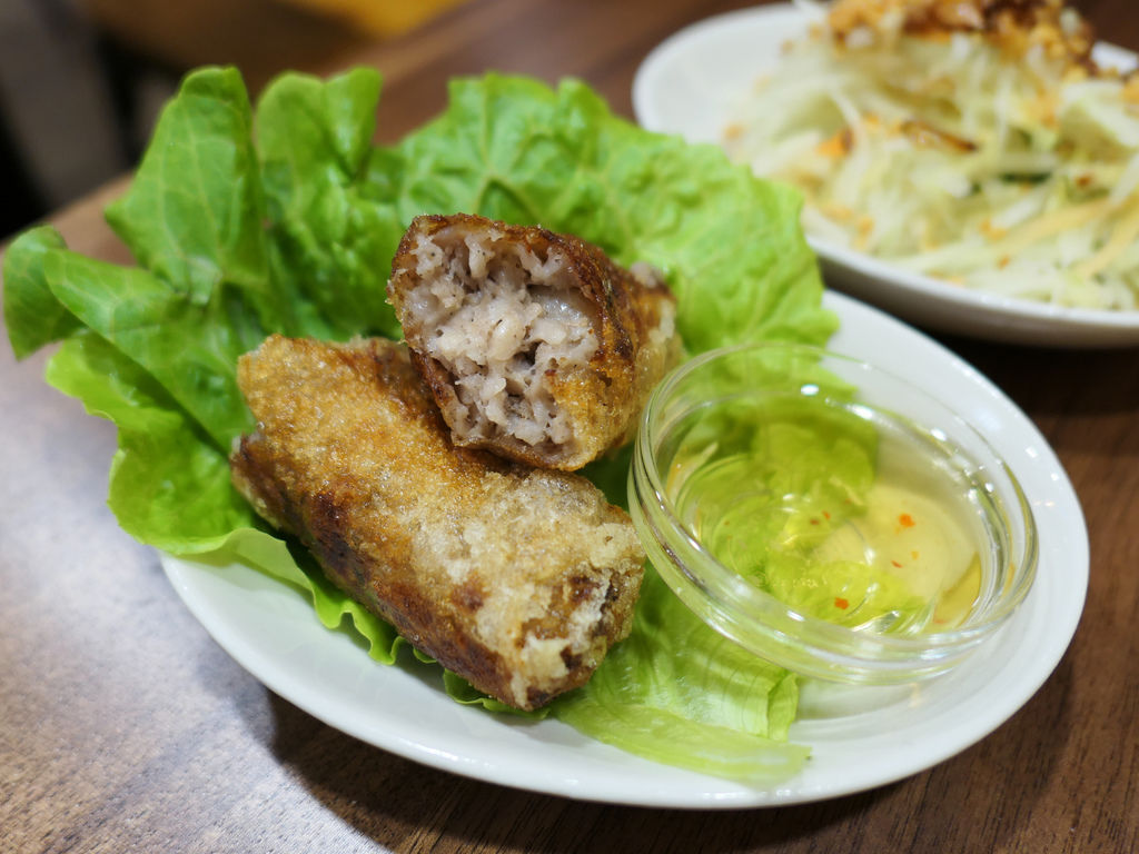 炸春捲裡頭是包裹著芋頭、碎肉及洋蔥,味道吃起來盡是香氣與自然甜味,建議可以用生菜包裹,沾上一旁的魚露享用,更清爽也更能凸顯出它的味道。
