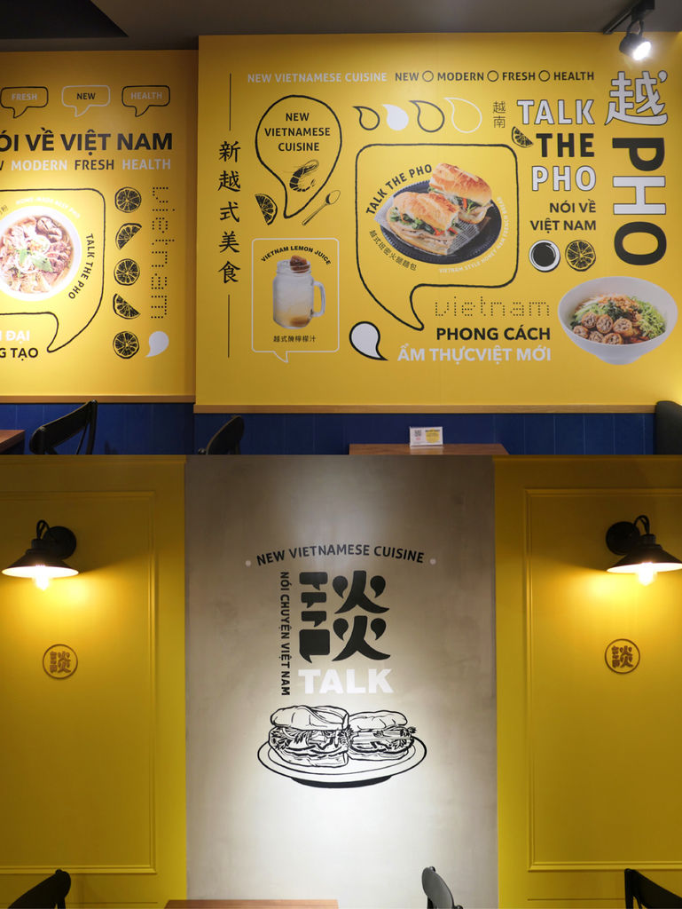 在大片的牆面上以漫畫形式般的Q版對話框,讓輕鬆談論越南美食這個概念主軸更為鮮明。