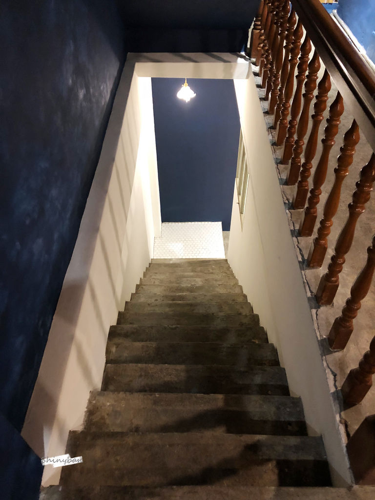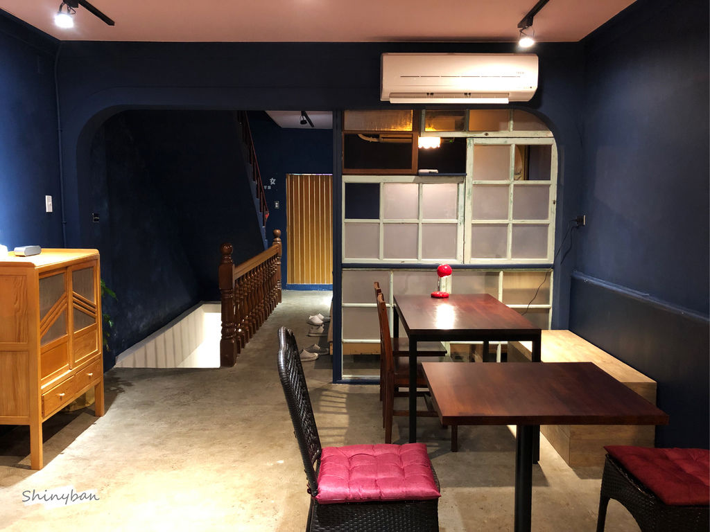 二樓改採水泥地面,搭配上深灰藍的牆面與暖暖的黃燈,兼具了時髦及懷舊風情。