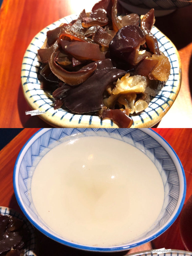 滷肉飯套餐可以選擇一樣小菜跟湯品或飲料。涼拌木耳沒有太重的調味,吃起來脆脆的很清爽,而蘿蔔湯跟麵疙瘩的湯頭似乎一樣,口味偏淡,配上滷肉飯挺搭的。