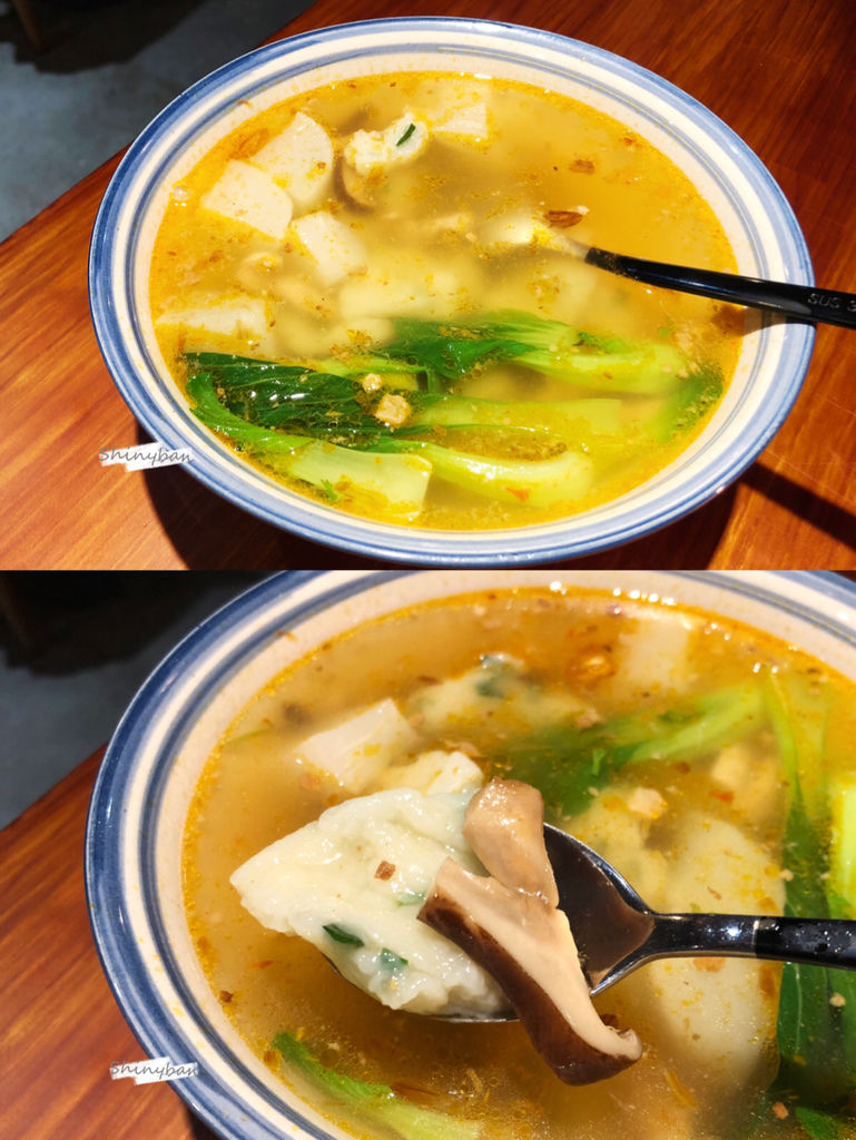 這裡的麵疙瘩是以蘿蔔湯為湯底,十分清淡,帶有蘿蔔本身清甜,而麵疙瘩裡則是包裹著韭菜增添香氣,配上少不了的香菇跟青江菜,是懷舊的簡單美味。麵疙瘩的口感滑嫩且扎實,帶有點麵粉味我很喜歡!