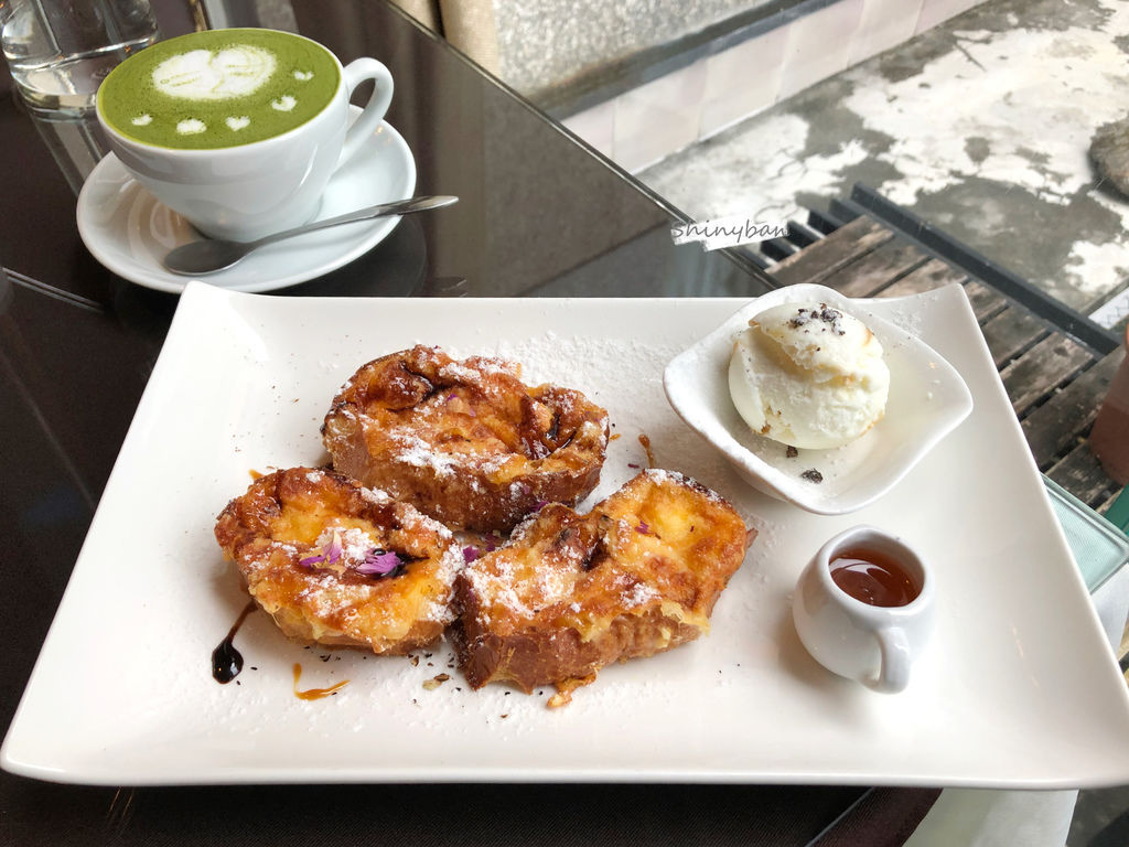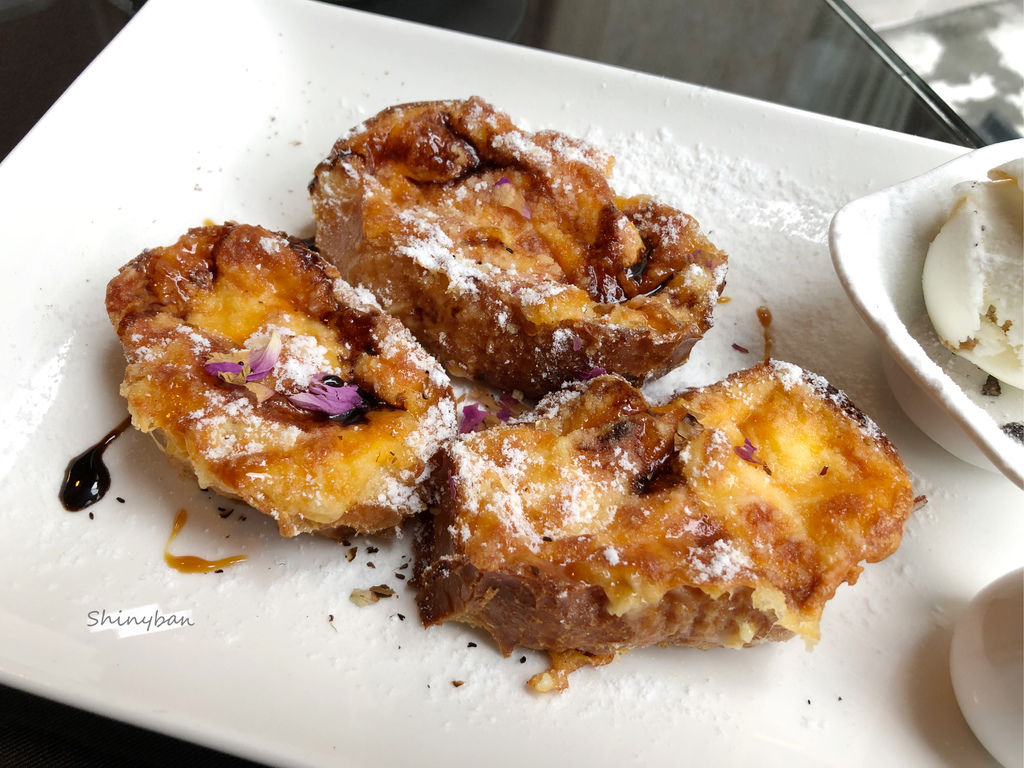 以蛋汁浸泡後的土司即使表面煎過後還是依舊軟嫩,上頭有起司的鹹,巧克力、糖粉、蜂蜜的甜,整個比例拿捏得剛剛好,鹹甜適中非常和諧。