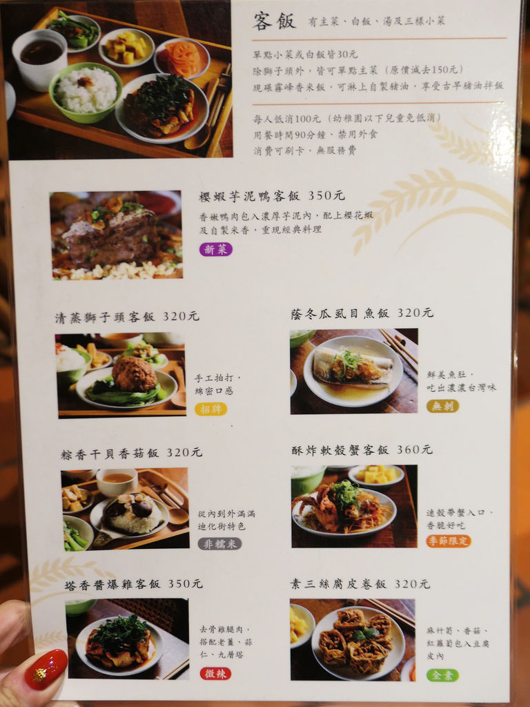 這道櫻蝦芋泥鴨客飯是店家的新菜色,是將大甲芋頭磨成泥,包裹住一絲絲的鴨肉,以油炸方式處理,外頭酥香,內層芋泥綿密香甜,又能嘗到香嫩的鴨肉,上頭再添加酥脆的櫻花蝦跟霧峰米香,更將口感及香氣提升了一個層次。