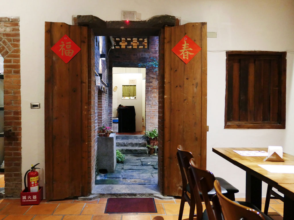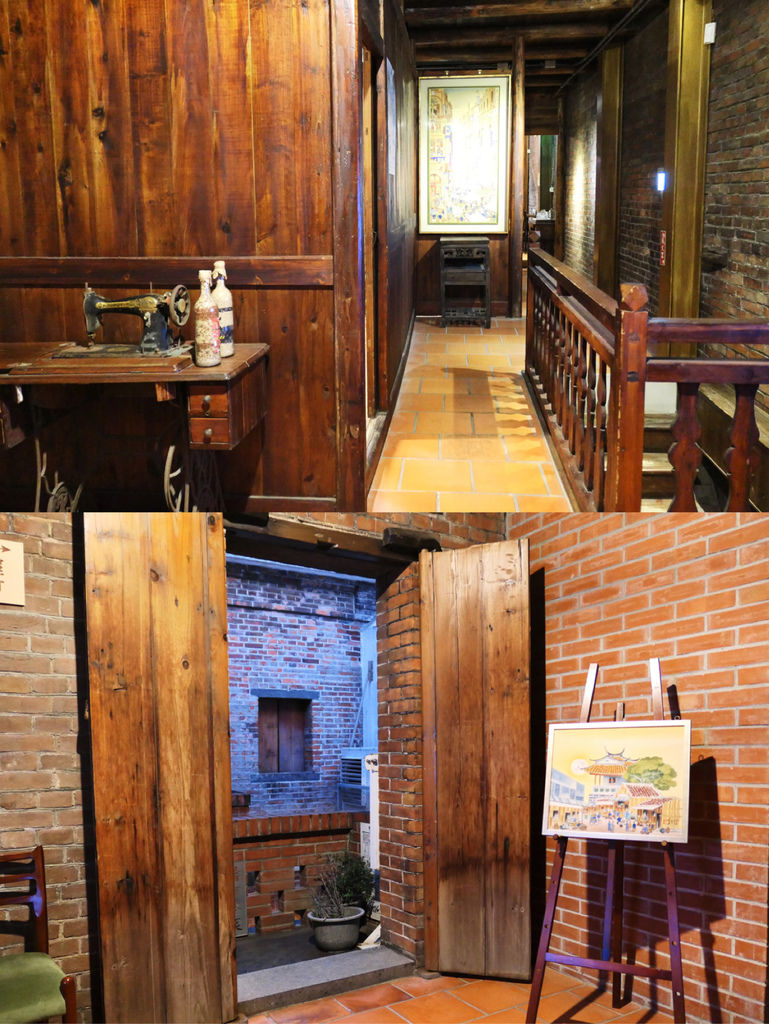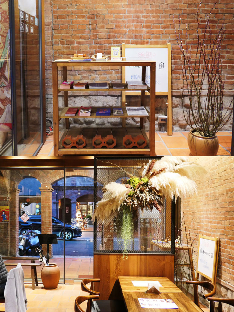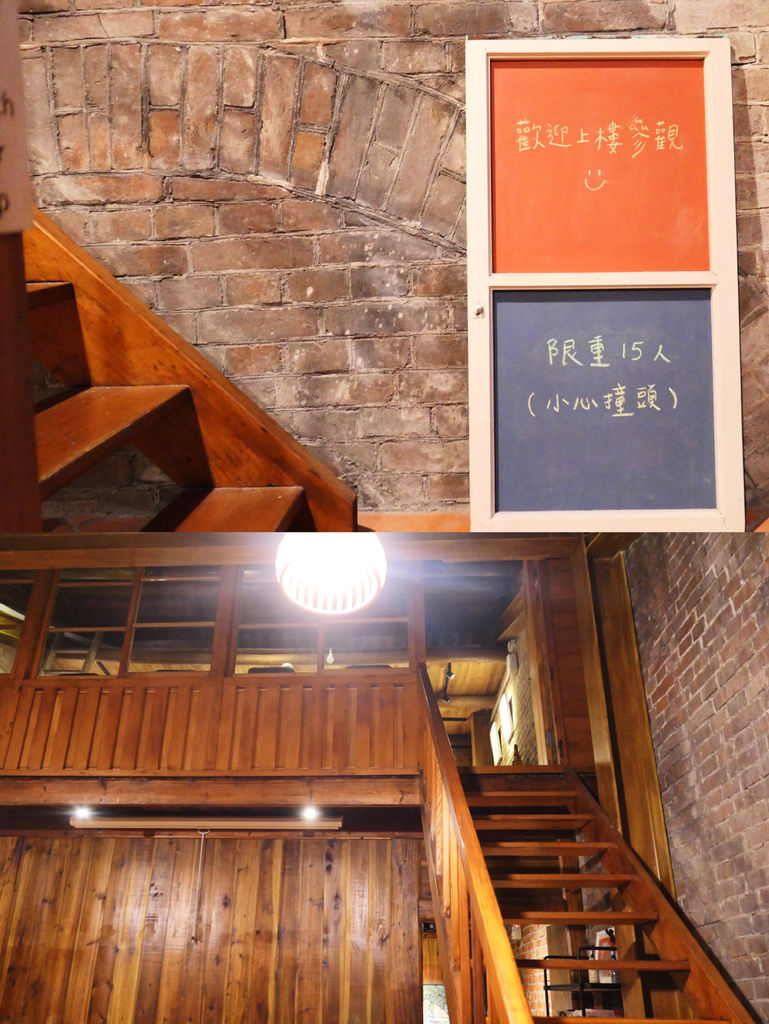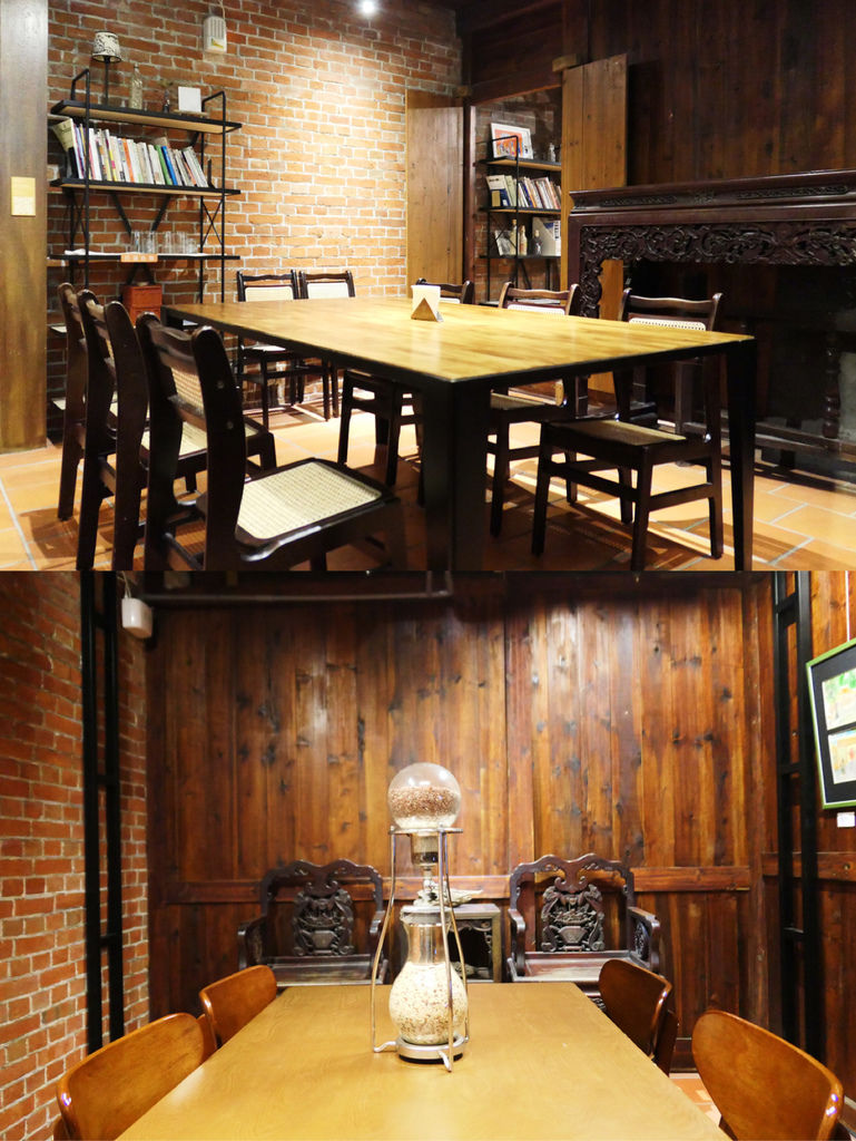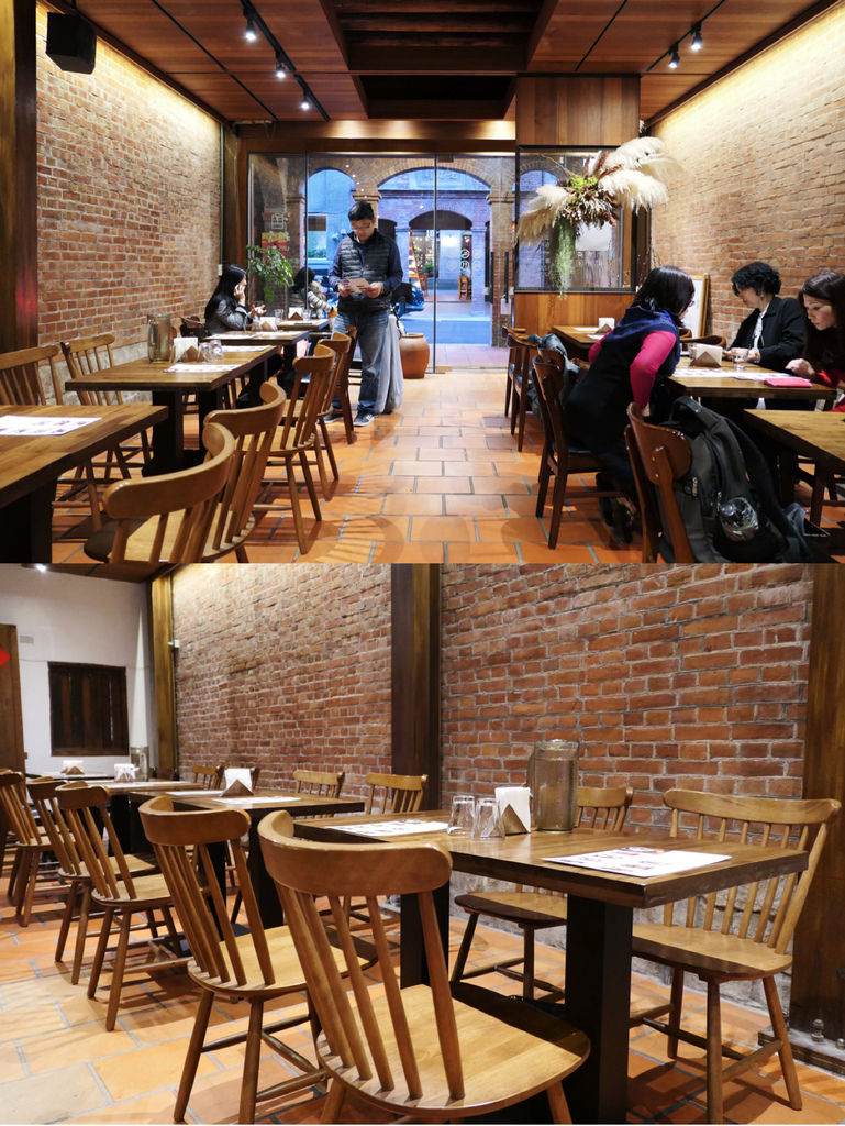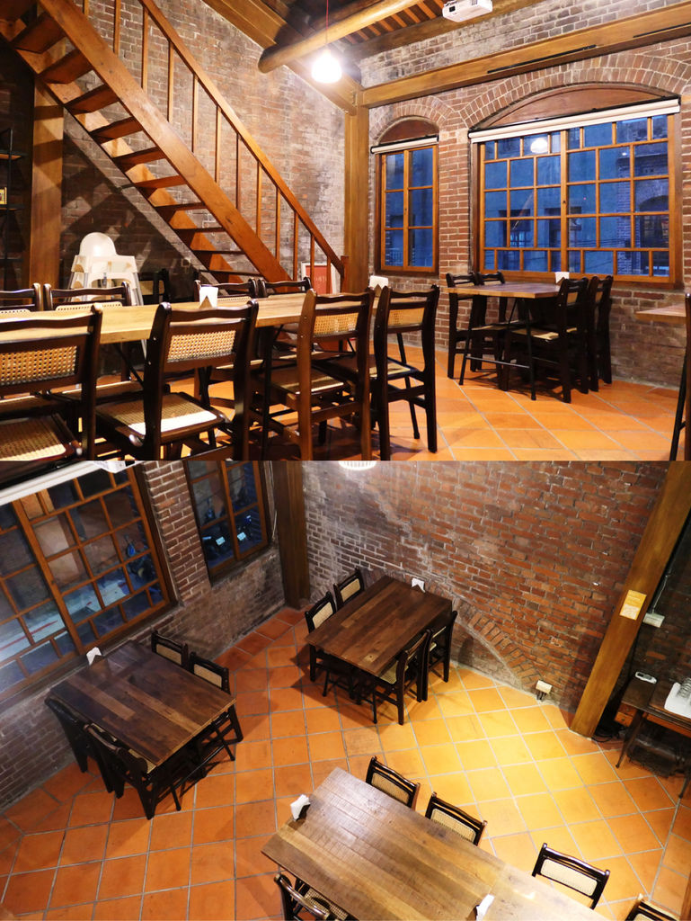 店內一樓為用餐區,維持原本百年老宅的樣貌,具有年代感的磚牆與磚瓦地板相得益彰,一些擺放的傢俱看似也是老件,木色桌椅配上黃燈,整體營造出懷舊又閒適的氛圍,實在醉人!