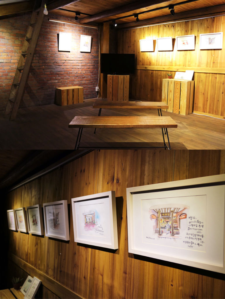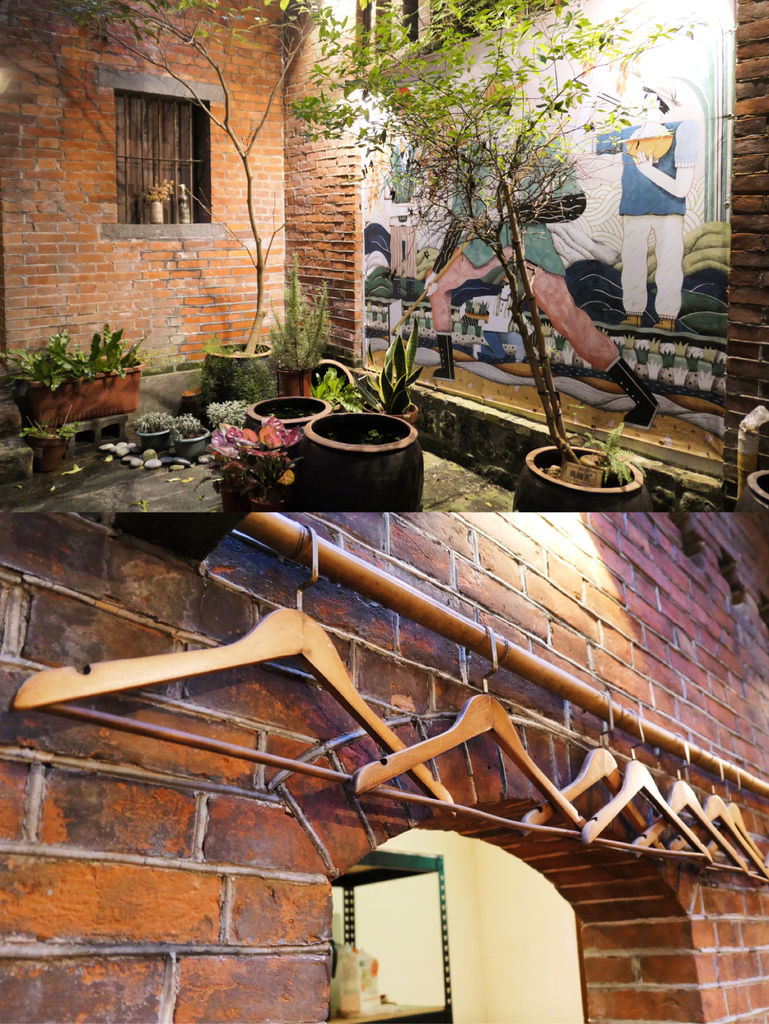 牆面上的畫作和隨意擺放的一些盆栽,在磚牆的包圍下,似乎一切都那麼合理。