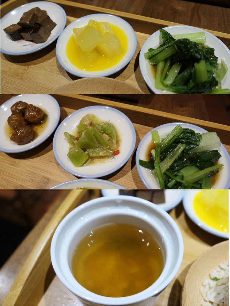 客飯有主菜、白飯、湯品及三樣小菜,小菜部分會隨店家採買到的食材做更換,當天吃到的分別是無花果、菜心、時蔬,比起許多餐廳來得精緻。而湯品部分則是金針花湯,口味較為清淡單純。