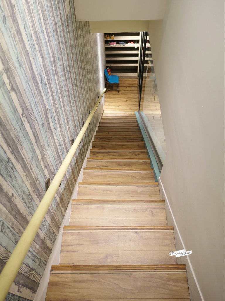 沿著樓梯走下地下室,是孩童遊憩區及用餐空間,樓梯梯面很大,一旁設有把手,光線也很充足,但還是要注意小朋友的安全。