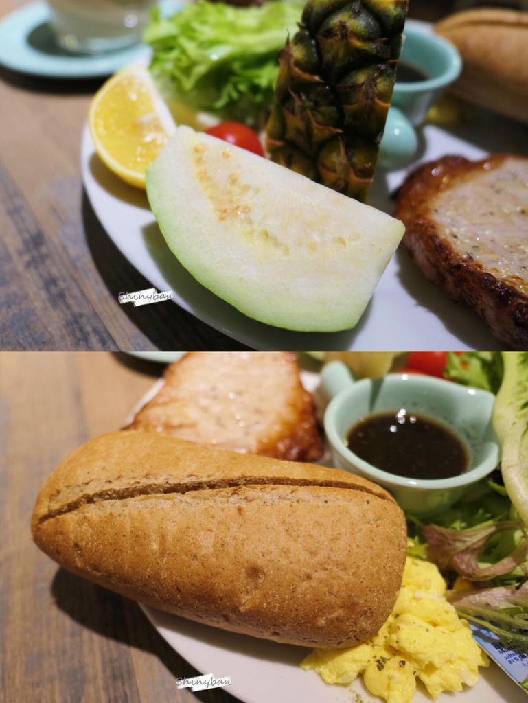 水果切的很大塊,麵包部分剛上桌熱騰騰的,抹上奶油或夾上炒蛋都很好吃。